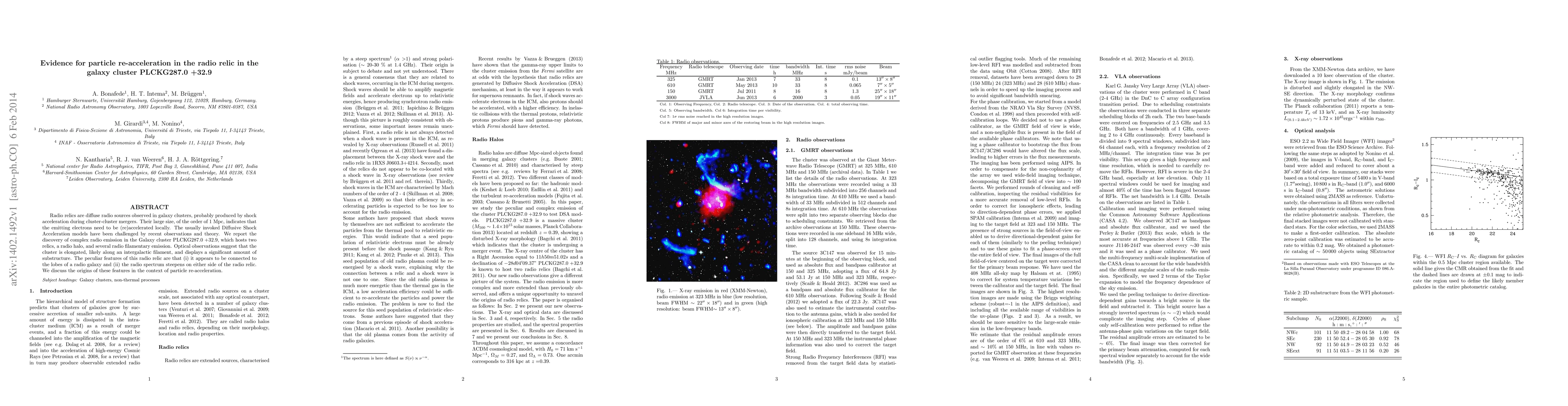 Radio relics are diffuse radio sources observed in galaxy clusters, probably produced by shock acceleration during cluster-cluster mergers. Their large size, of the order of 1 Mpc, indicates that the emitting electrons need to be (re)accelerated locally. The usually invoked Diffusive Shock Acceleration models have been challenged by recent observations and theory. We report the discovery of complex radio emission in the Galaxy cluster PLCKG287.0 +32.9, which hosts two relics, a radio halo, and several radio filamentary emission. Optical observations suggest that the cluster is elongated, likely along an intergalactic filament, and displays a significant amount of substructure. The peculiar features of this radio relic are that (i) it appears to be connected to the lobes of a radio galaxy and (ii) the radio spectrum steepens on either side of the radio relic. We discuss the origins of these features in the context of particle re-acceleration.