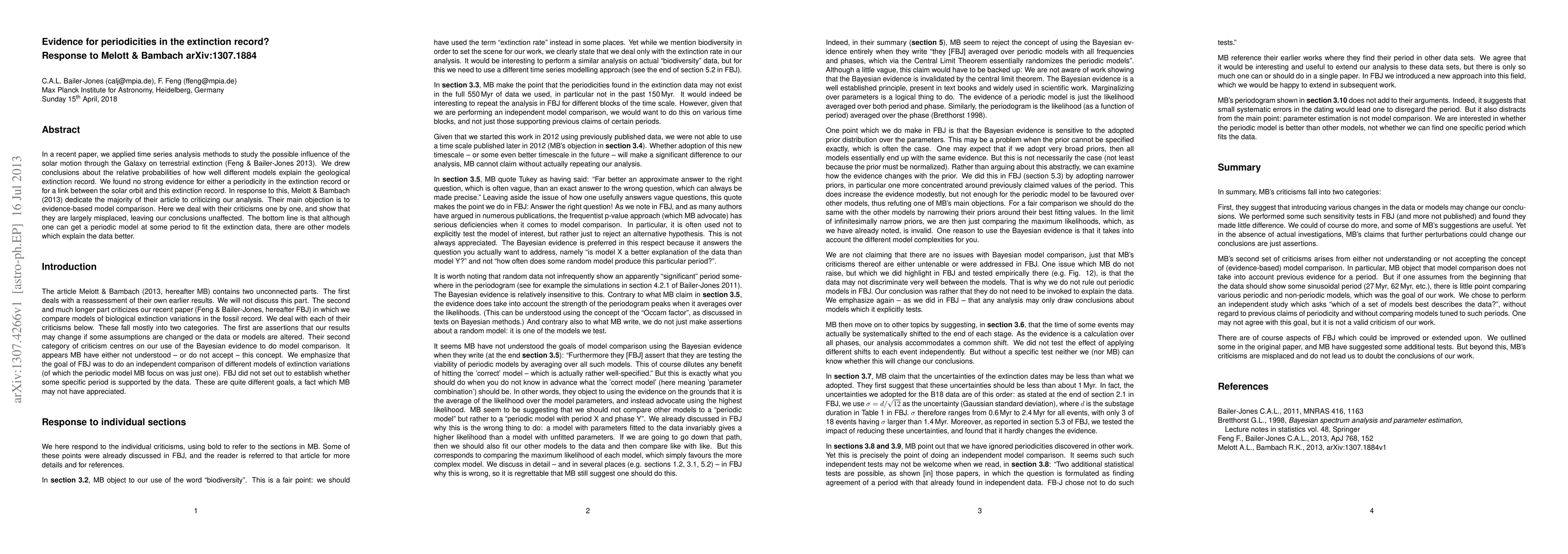 In a recent paper, we applied time series analysis methods to study the possible influence of the solar motion through the Galaxy on terrestrial extinction (Feng & Bailer-Jones 2013). We drew conclusions about the relative probabilities of how well different models explain the geological extinction record. We found no strong evidence for either a periodicity in the extinction record or for a link between the solar orbit and this extinction record. In response to this, Melott & Bambach (2013) dedicate the majority of their article to criticizing our analysis. Their main objection is to evidence-based model comparison. Here we deal with their criticisms one by one, and show that they are largely misplaced, leaving our conclusions unaffected. The bottom line is that although one can get a periodic model at some period to fit the extinction data, there are other models which explain the data better.