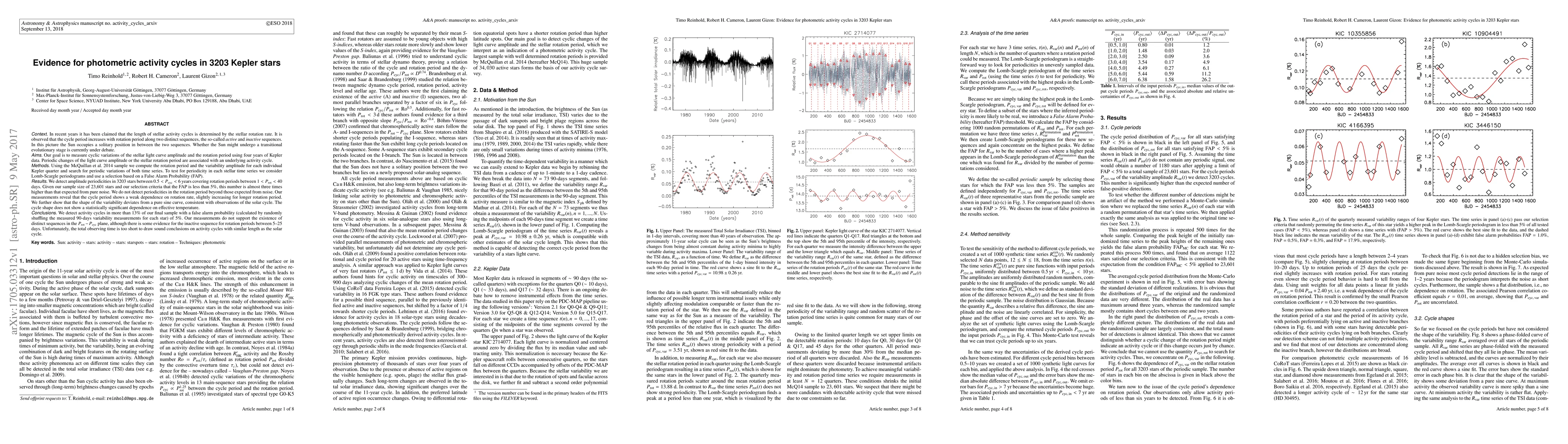 This study, using Kepler data, detected cyclic variations in the light curve amplitude of 3203 stars, suggesting stellar activity cycles lasting 0.5-6 years. The cycle period was found to slightly increase with rotation rate, challenging the claim of a direct relationship between cycle length and rotation rate. The research also noted a deviation from pure sine-wave variability, similar to the solar cycle, but didn't find distinct active and inactive sequences in the rotation-cycle period plane due to limited observing time.