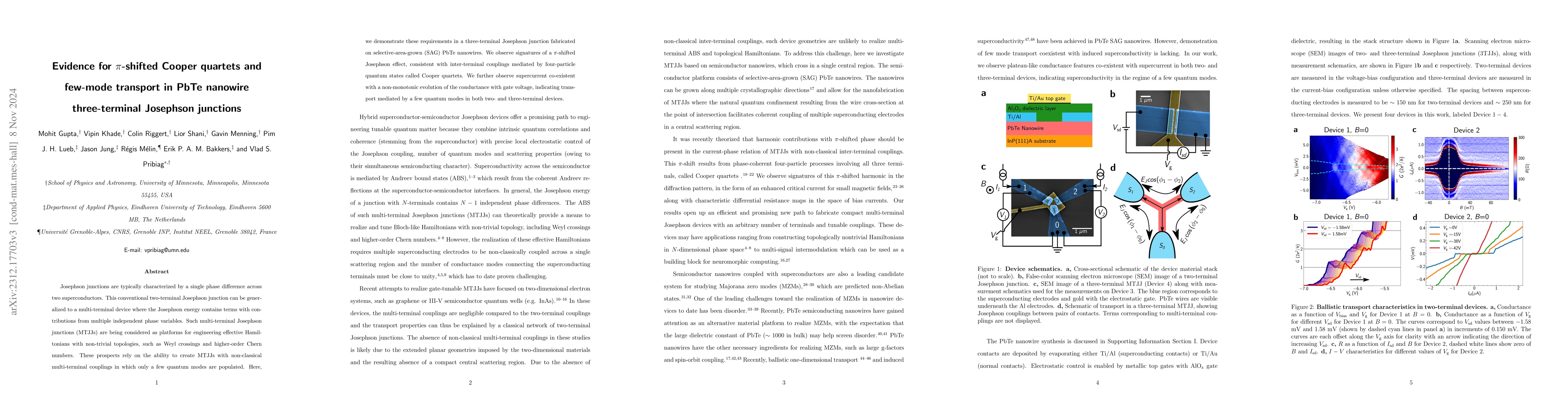 This research demonstrates $\pi$-shifted Cooper quartets and few-mode transport in PbTe nanowire three-terminal Josephson junctions, indicating multi-terminal couplings mediated by four-particle quantum states. The study also reveals supercurrent alongside non-monotonic conductance variations, suggesting transport through a limited number of quantum modes.