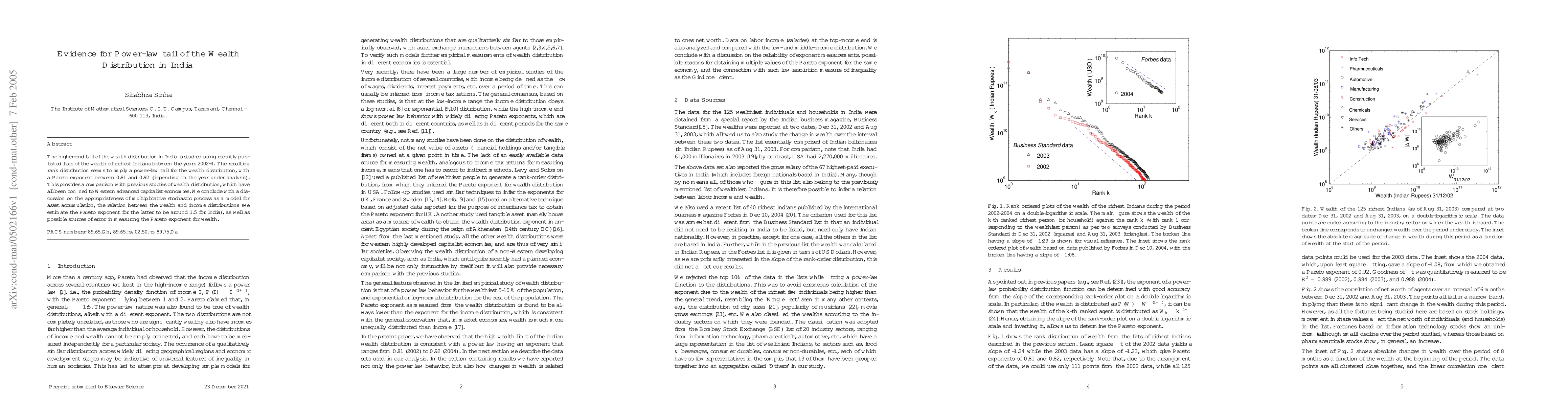 This study analyzes the wealth distribution in India, finding a power-law tail with a Pareto exponent between 0.81 and 0.92 for the richest individuals from 2002-2004, contrasting with previous Western studies. It also discusses the applicability of stochastic processes to wealth accumulation and estimates the income distribution's Pareto exponent at around 1.5.