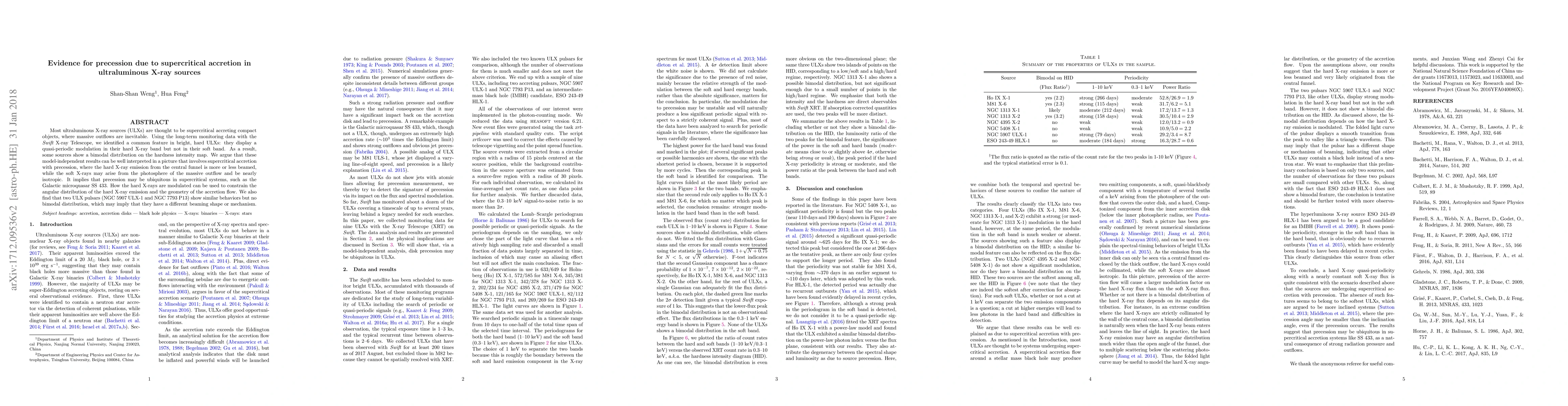 This paper identifies quasi-periodic modulation in the hard X-ray band of bright ultraluminous X-ray sources (ULXs), suggesting precession in supercritical accretion flows. The observed bimodal distribution in some ULXs supports a model where hard X-rays are beamed from the central funnel, while soft X-rays are nearly isotropic from the outflow photosphere.