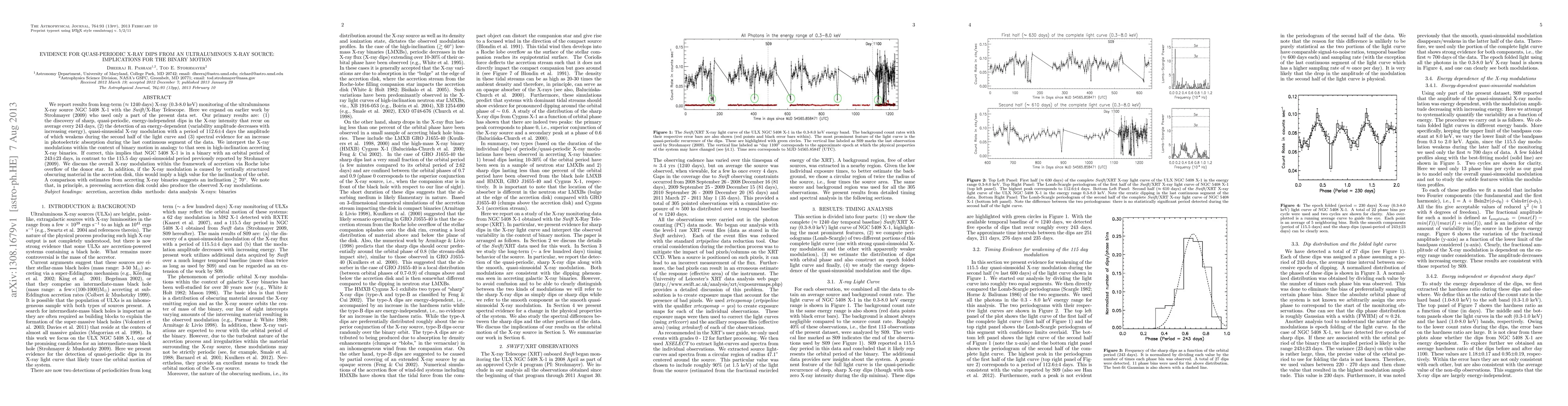 The study monitors the ultraluminous X-ray source NGC 5408 X-1 with Swift/X-Ray Telescope for 1240 days, discovering quasi-periodic X-ray dips recurring every 243 days, an energy-dependent modulation of 112.6 days, and increased absorption. The findings suggest a binary system with an orbital period of 243 days and a high inclination (>70 degrees), possibly due to Roche lobe overflow or a precessing accretion disk.