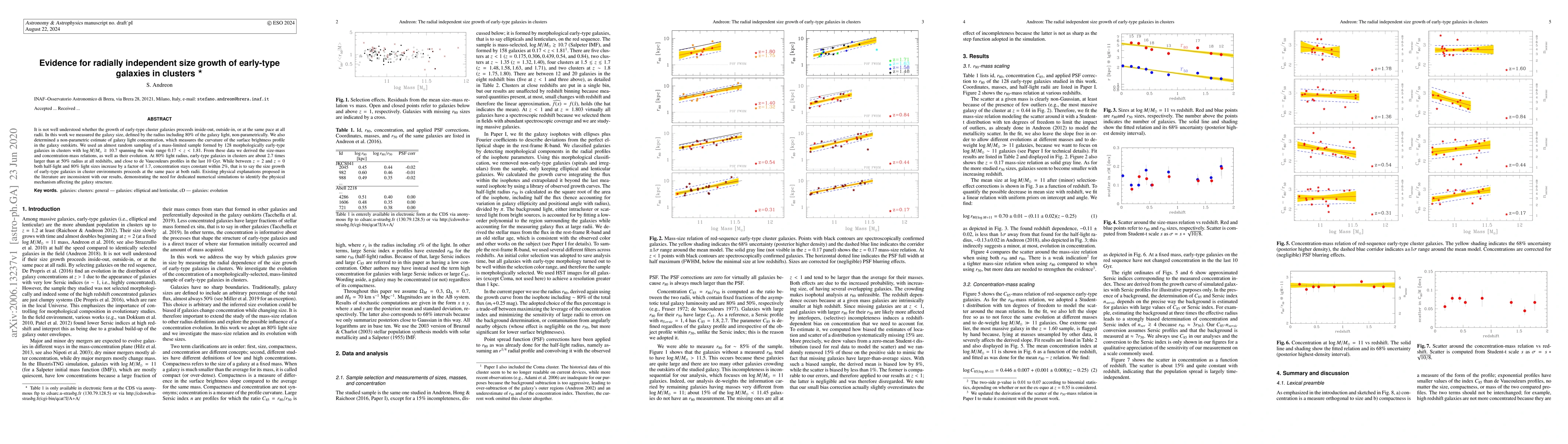 This study finds that early-type galaxies in clusters grow radially independently, with size growth proceeding at the same pace at both 50% and 80% light radii over the last 10 billion years, despite a concentration of light remaining constant within 2%. This challenges existing models and suggests a need for new simulations to understand the underlying physical processes.