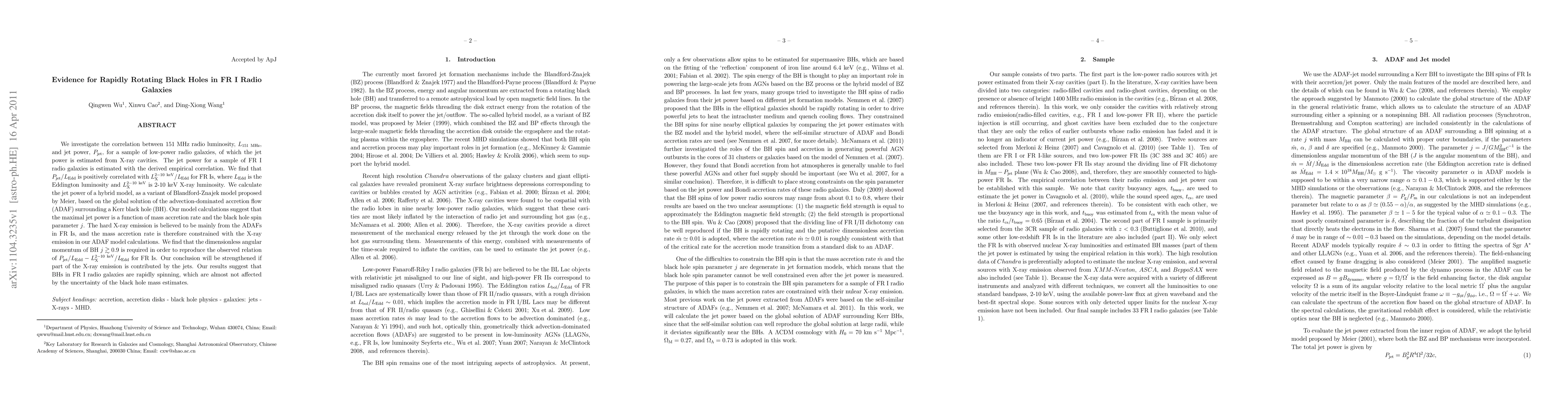 We investigate the correlation between 151 MHz radio luminosity, L_151MHz, and jet power, P_jet, for a sample of low-power radio galaxies, of which the jet power is estimated from X-ray cavities. The jet power for a sample of FR I radio galaxies is estimated with the derived empirical correlation. We find that P_jet/L_Edd is positively correlated with Lx(2-10 keV)/L_Edd for FR Is, where L_Edd is the Eddington luminosity and Lx(2-10 keV) is 2-10 keV X-ray luminosity. We calculate the jet power of a hybrid model, as a variant of Blandford-Znajek model proposed by Meier, based on the global solution of the advection-dominated accretion flow (ADAF) surrounding a Kerr black hole (BH). Our model calculations suggest that the maximal jet power is a function of mass accretion rate and the black hole spin parameter j. The hard X-ray emission is believed to be mainly from the ADAFs in FR Is, and the mass accretion rate is therefore constrained with the X-ray emission in our ADAF model calculations. We find that the dimensionless angular momentum of BH j>~0.9 is required in order to reproduce the observed relation of P_jet/L_Edd-Lx(2-10 keV)/L_Edd for FR Is. Our conclusion will be strengthened if part of the X-ray emission is contributed by the jets. Our results suggest that BHs in FR I radio galaxies are rapidly spinning, which are almost not affected by the uncertainty of the black hole mass estimates.
