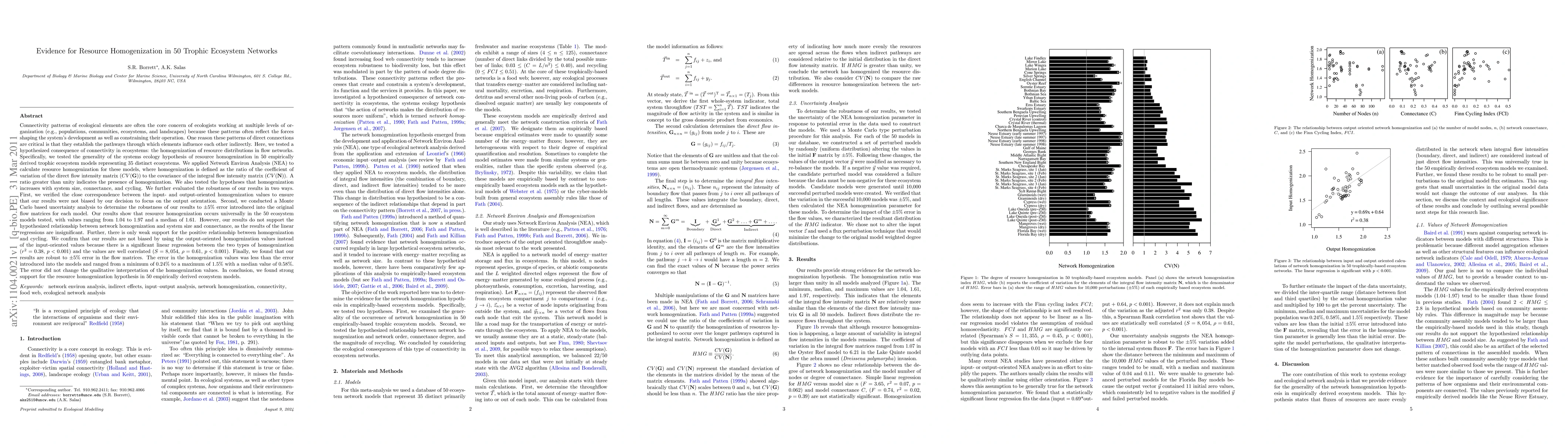 Connectivity patterns of ecological elements are often the core concern of ecologists working at multiple levels of organization (e.g., populations, ecosystems, and landscapes) because these patterns often reflect the forces shaping the system's development as well as constraining their operation. One reason these patterns of direct connections are critical is that they establish the pathways through which elements influence each other indirectly. Here, we tested a hypothesized consequence of connectivity in ecosystems: the homogenization of resource distributions in flow networks. Specifically, we tested the generality of the systems ecology hypothesis of resource homogenization in 50 empirically derived trophic ecosystem models representing 35 distinct ecosystems. We applied Ecological Network Analysis to calculate resource homogenization for these models. We further evaluated the robustness of our results in two ways. First, we verified the close correspondence between the input- and output-oriented homogenization values to ensure that our results were not biased by our decision to focus on the output orientation. Second, we conducted a Monte Carlo based uncertainty analysis to determine the robustness of our results to +/-5% error introduced into the original flow matrices for each model. Our results show that resource homogenization occurs universally in the 50 ecosystem models tested. We confirm that our results are not biased by using the output-oriented homogenization values because there is a significant linear regression between the input and output oriented homogenization (r^2 = 0.38, p < 0.001). Finally, we found that our results are robust to +/-5% error in the flow matrices. In conclusion, we found strong support for the resource homogenization hypothesis in 50 empirically derived ecosystem models.
