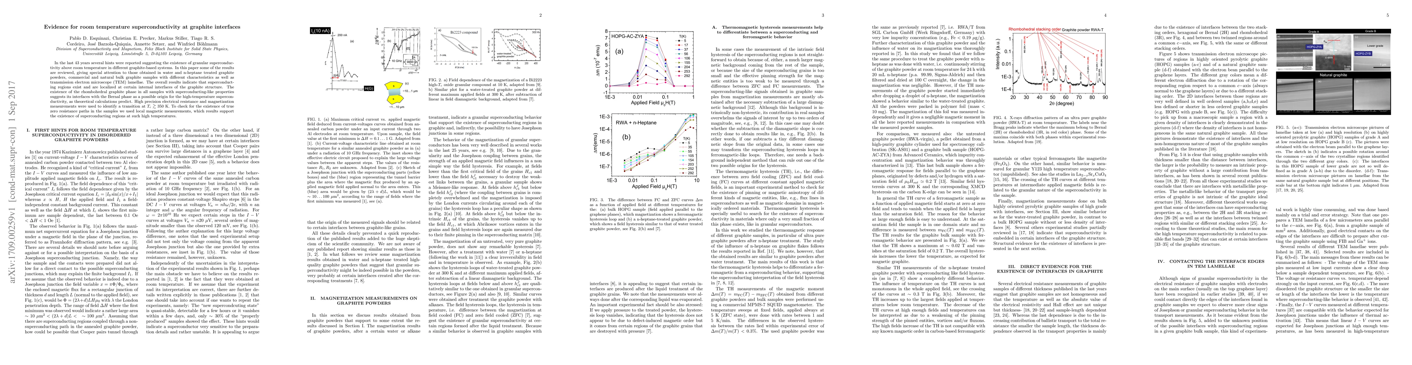 This paper reviews evidence suggesting the existence of room temperature superconductivity in various graphite-based systems, particularly at internal interfaces. High precision measurements indicate a transition temperature above 350 K, supporting the presence of superconducting regions.