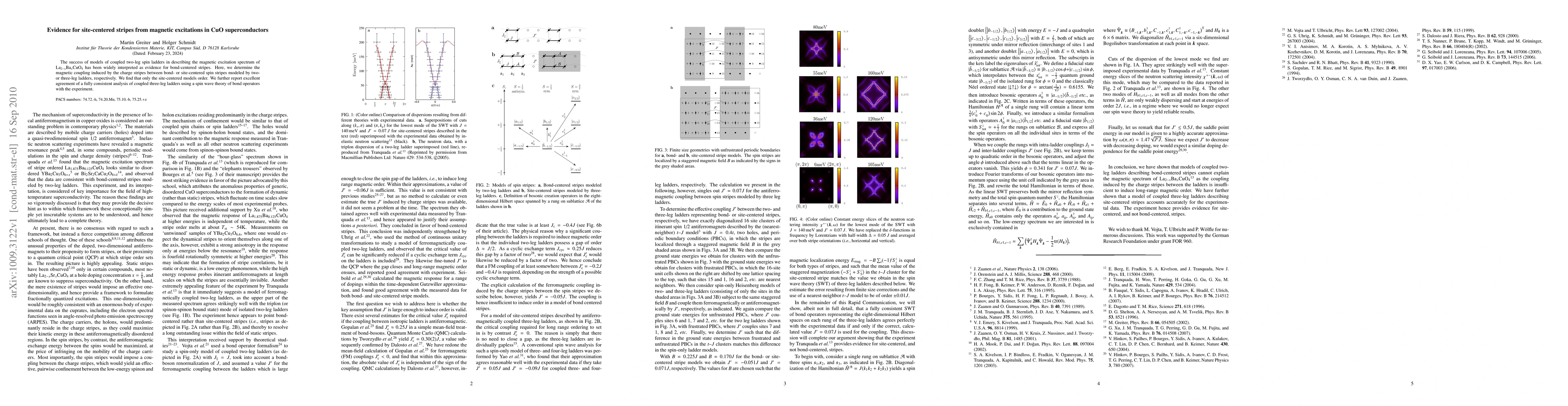 This research demonstrates that site-centered spin stripes, rather than bond-centered ones, are responsible for magnetic excitations in CuO superconductors, as evidenced by a consistent analysis using coupled three-leg ladders and spin wave theory. The study supports the ordering of site-centered models over bond-centered ones.