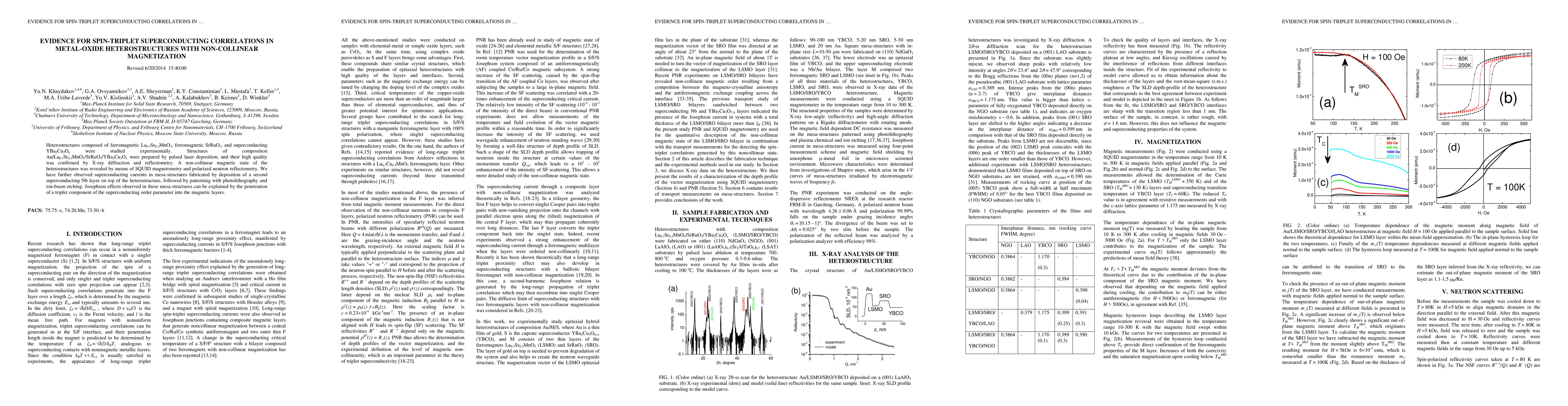 This paper reports experimental evidence for spin-triplet superconducting correlations in metal-oxide heterostructures with non-collinear magnetization, revealing Josephson effects attributable to the penetration of a triplet component of the superconducting order parameter into magnetic layers. The heterostructures were fabricated using pulsed laser deposition and confirmed for high quality via X-ray diffraction and reflectometry.
