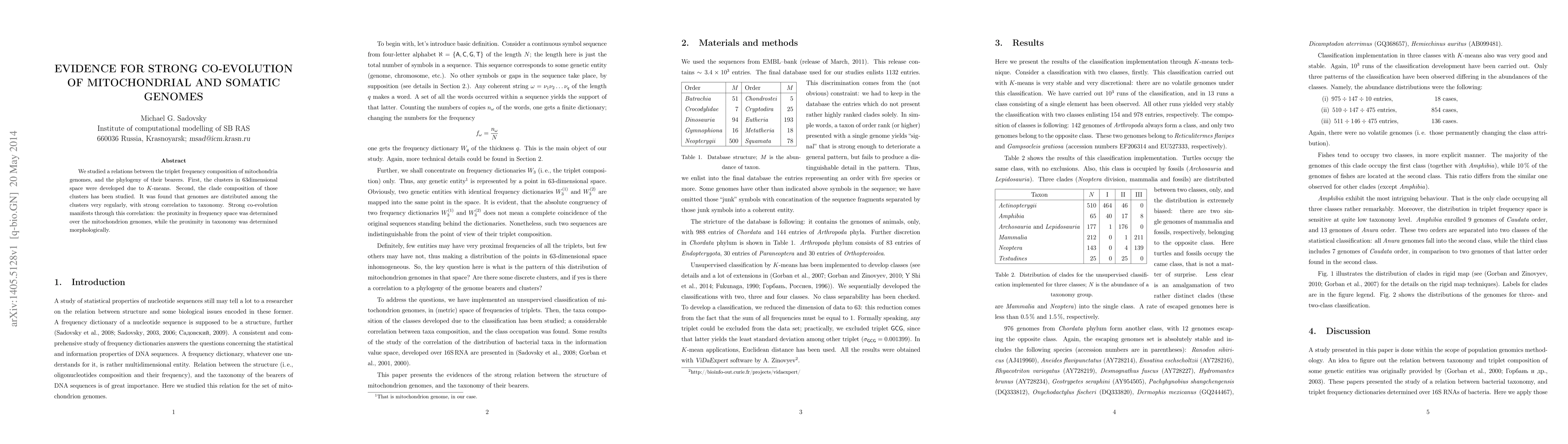 We studied a relations between the triplet frequency composition of mitochondria genomes, and the phylogeny of their bearers. First, the clusters in 63dimensional space were developed due to $K$-means. Second, the clade composition of those clusters has been studied. It was found that genomes are distributed among the clusters very regularly, with strong correlation to taxonomy. Strong co-evolution manifests through this correlation: the proximity in frequency space was determined over the mitochondrion genomes, while the proximity in taxonomy was determined morphologically.