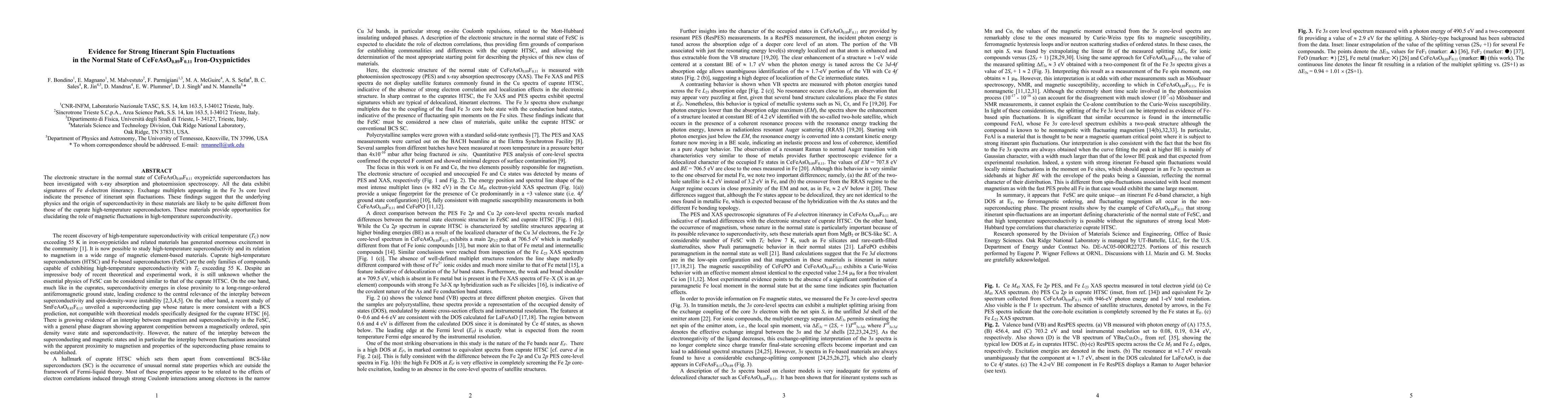 The electronic structure in the normal state of CeFeAsO0.89F0.11 oxypnictide superconductors has been investigated with x-ray absorption and photoemission spectroscopy. All the data exhibit signatures of Fe d-electron itinerancy. Exchange multiplets appearing in the Fe 3s core level indicate the presence of itinerant spin fluctuations. These findings suggest that the underlying physics and the origin of superconductivity in these materials are likely to be quite different from those of the cuprate high-temperature superconductors. These materials provide opportunities for elucidating the role of magnetic fluctuations in high-temperature superconductivity.