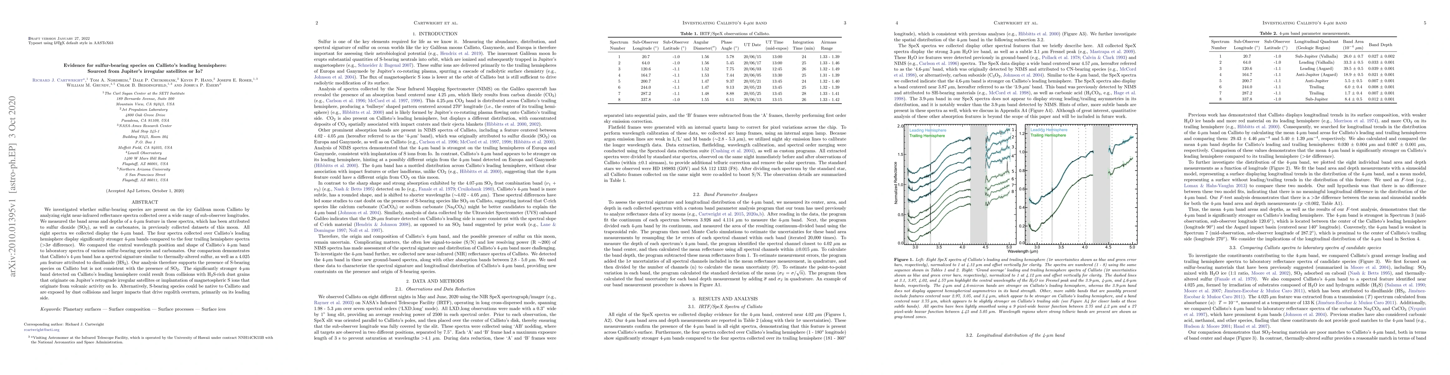 This study finds evidence of sulfur-bearing species on Callisto's leading hemisphere, with a stronger 4-micron band likely due to H2S-rich dust from Jupiter's irregular satellites or S ions from Io's volcanic activity, rather than sulfur dioxide. The spectral signature suggests thermally-altered sulfur and disulfanide.