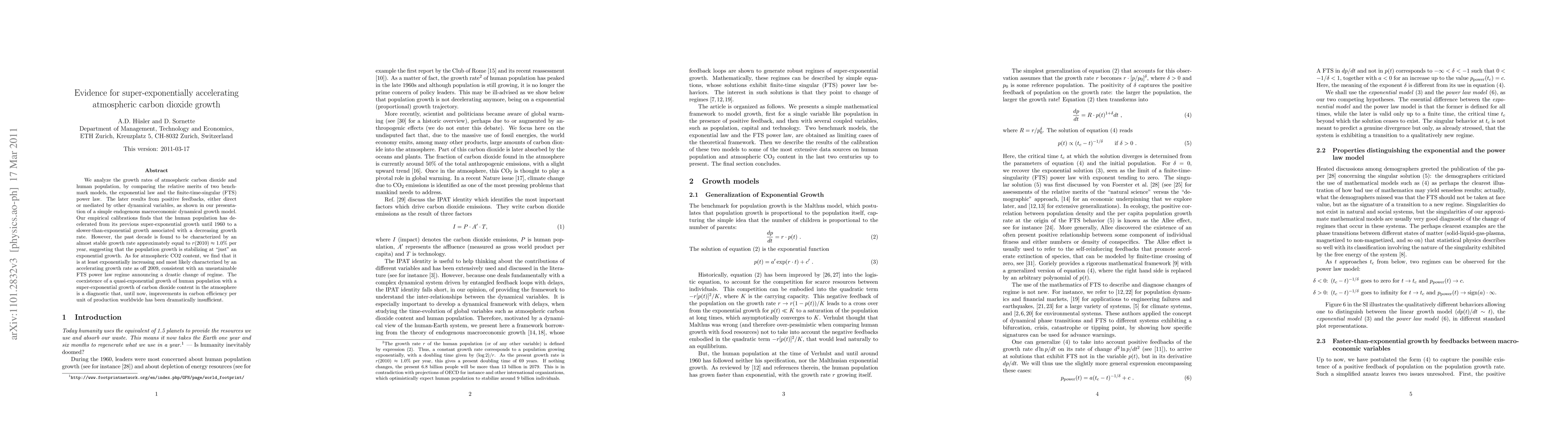 We analyze the growth rates of atmospheric carbon dioxide and human population, by comparing the relative merits of two benchmark models, the exponential law and the finite-time-singular (FTS) power law. The later results from positive feedbacks, either direct or mediated by other dynamical variables, as shown in our presentation of a simple endogenous macroeconomic dynamical growth model. Our empirical calibrations finds that the human population has decelerated from its previous super-exponential growth until 1960 to a slower-than-exponential growth associated with a decreasing growth rate. However, the past decade is found to be characterized by an almost stable growth rate approximately equal to r(2010) ~ 1% per year, suggesting that the population growth is stabilizing at "just" an exponential growth. As for atmospheric CO2 content, we find that it is at least exponentially increasing and most likely characterized by an accelerating growth rate as off 2009, consistent with an unsustainable FTS power law regime announcing a drastic change of regime. The coexistence of a quasi-exponential growth of human population with a super-exponential growth of carbon dioxide content in the atmosphere is a diagnostic that, until now, improvements in carbon efficiency per unit of production worldwide has been dramatically insufficient.