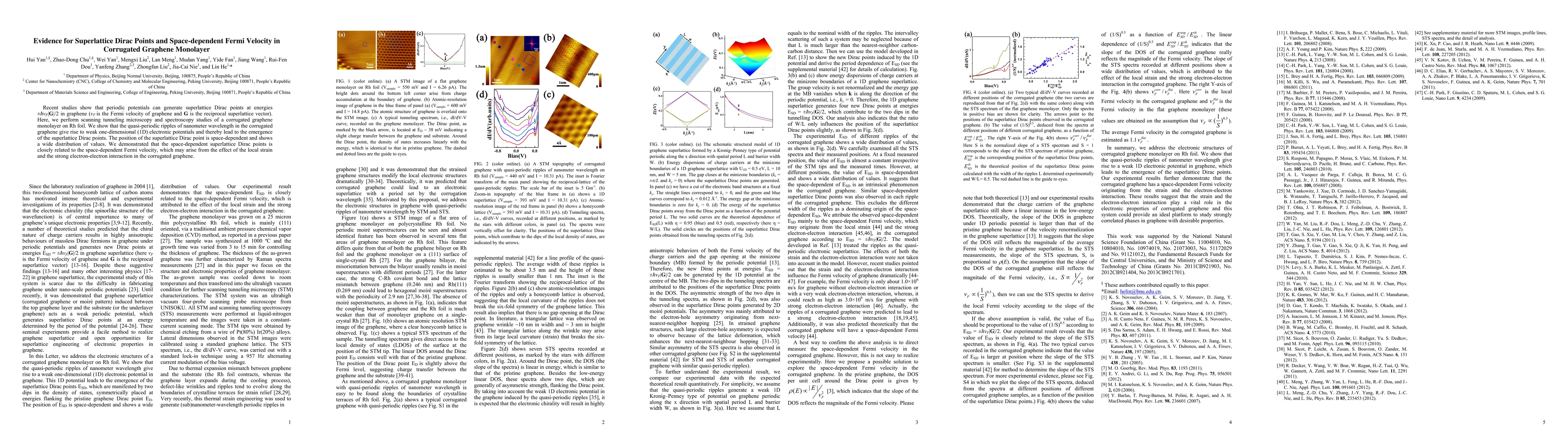 Summary: This study uses scanning tunneling microscopy to demonstrate that quasi-periodic ripples in a corrugated graphene monolayer create weak 1D electronic potentials, leading to the emergence of space-dependent superlattice Dirac points. The spatial variability in these points correlates with a space-dependent Fermi velocity, influenced by local strain and electron-electron interactions.