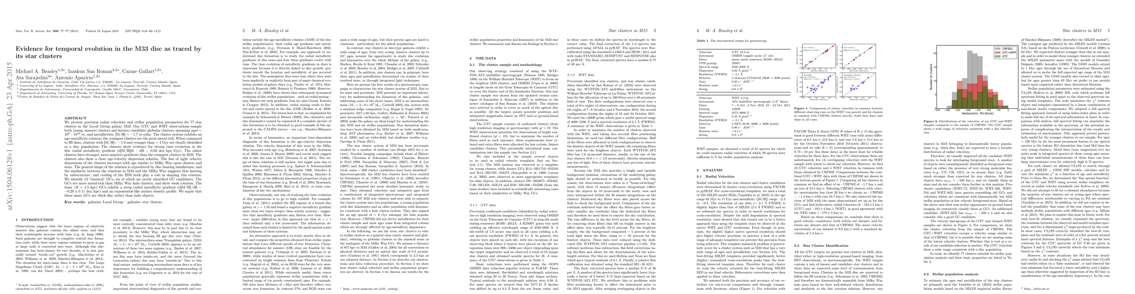 The research identifies an age-metallicity relation in M33's star clusters, with younger clusters being more metal-rich. It also reveals temporal evolution in the disc's radial metallicity gradient and a strong age-velocity dispersion relation, suggesting disc heating and ISM cooling dynamics similar to the Milky Way. The study distinguishes 'classical' GCs in M33, finding them metal-rich and showing weak rotation, and proposes these inner GCs are part of a thick disc rather than a halo.