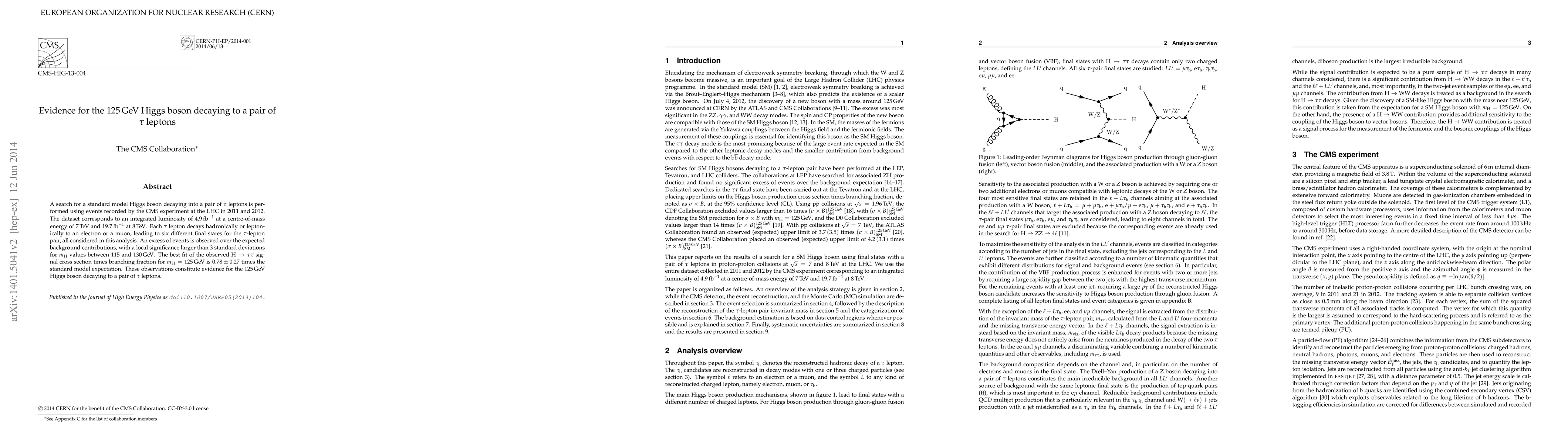 The CMS experiment at the LHC observed an excess of events consistent with a 125 GeV Higgs boson decaying to a pair of tau leptons, with a local significance exceeding 3 standard deviations. The measured signal cross section aligns with the standard model prediction.