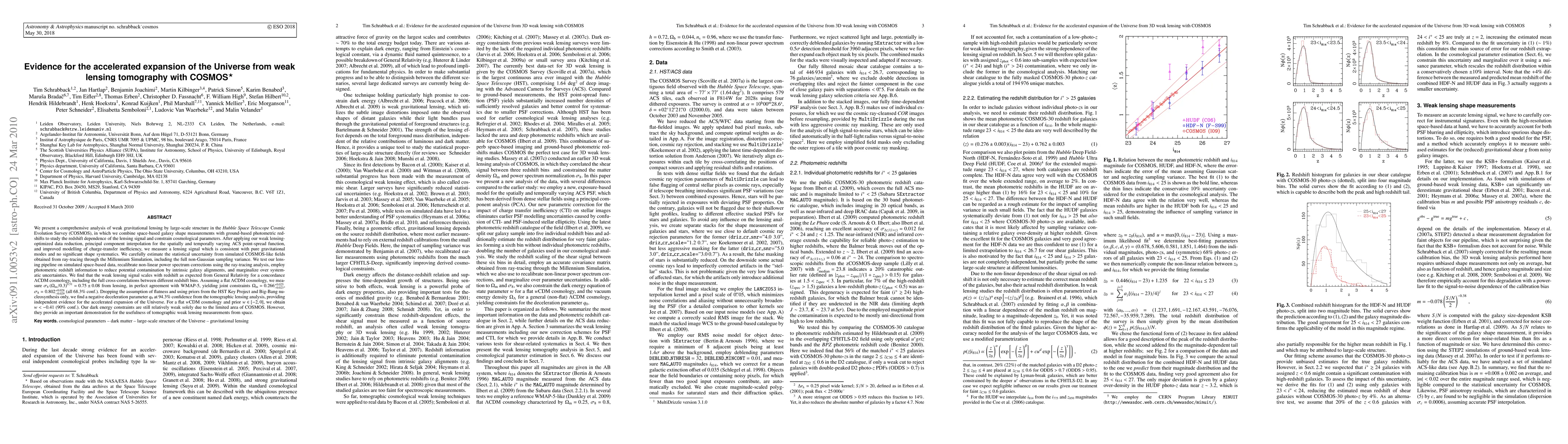 This paper presents a tomographic weak lensing analysis from the COSMOS survey, finding evidence for the accelerated expansion of the Universe. The study measures a lensing signal consistent with General Relativity, yielding constraints on Omega_m and sigma_8, and finds a negative deceleration parameter q_0 at 94.3% confidence, supporting dark energy-driven acceleration.
