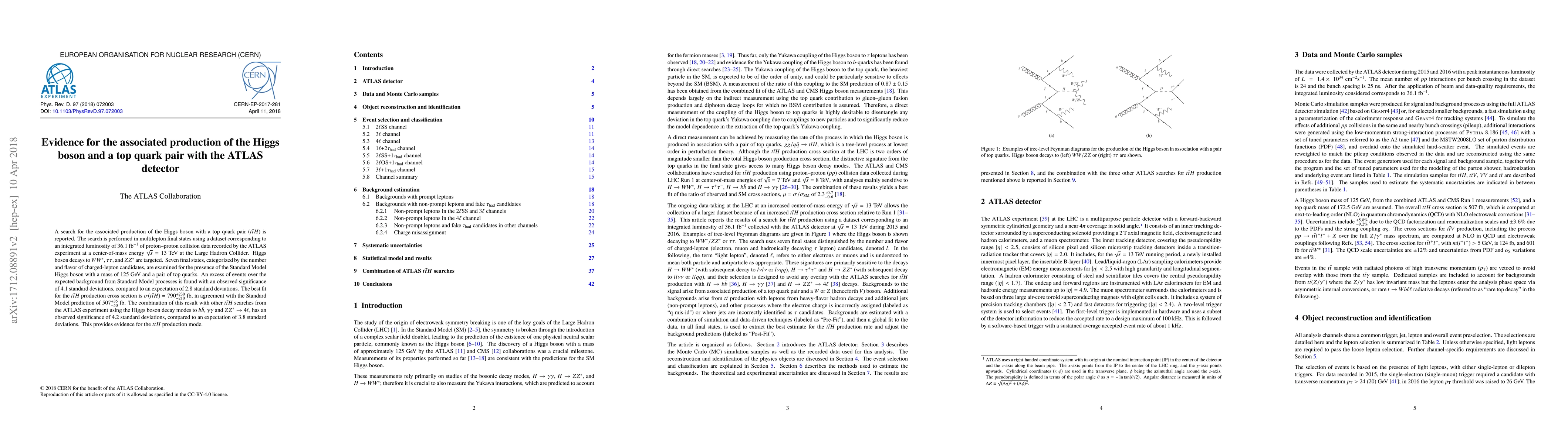 The ATLAS experiment reports a search for the associated production of the Higgs boson with a top quark pair ($t\bar t H$) using 36.1 fb$^{-1}$ of proton-proton collision data at $\sqrt{s} = 13$ TeV. An excess of events with a significance of 4.1 standard deviations indicates evidence for the $t\bar t H$ production mode, consistent with Standard Model predictions.