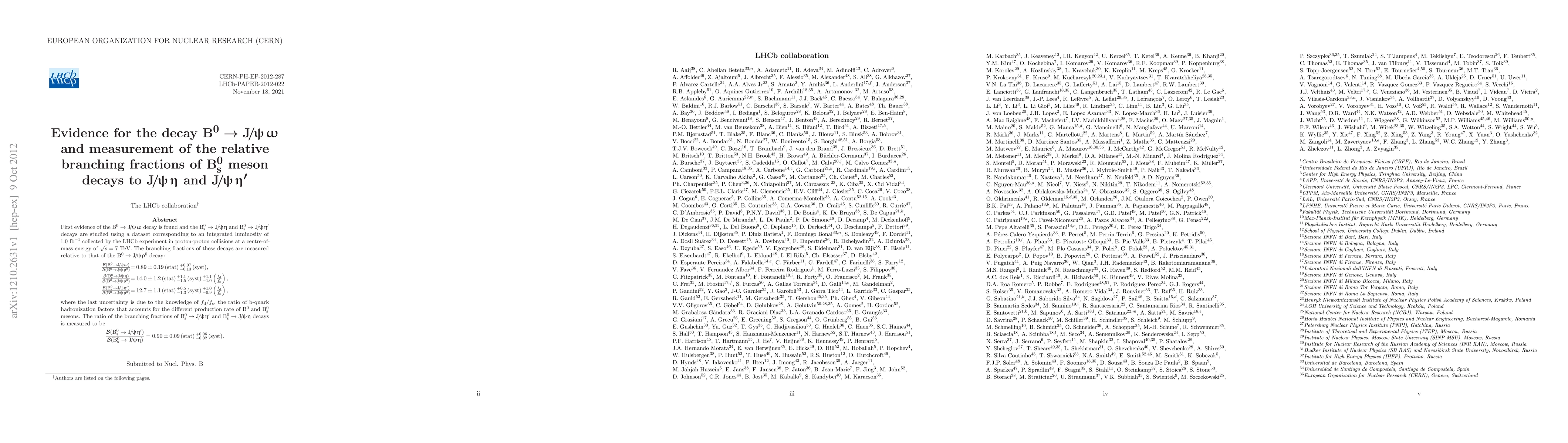 The LHCb experiment reports the first evidence for the decay $B^0\to J/\psi\omega$ and measures the relative branching fractions of $B^0_s$ meson decays to $J/\psi\eta$ and $J/\psi\eta^{\prime}$, finding a ratio of these decays to be $0.90\pm0.09$. The relative branching fractions are determined with respect to $B^0\to J/\psi\rho^0$.