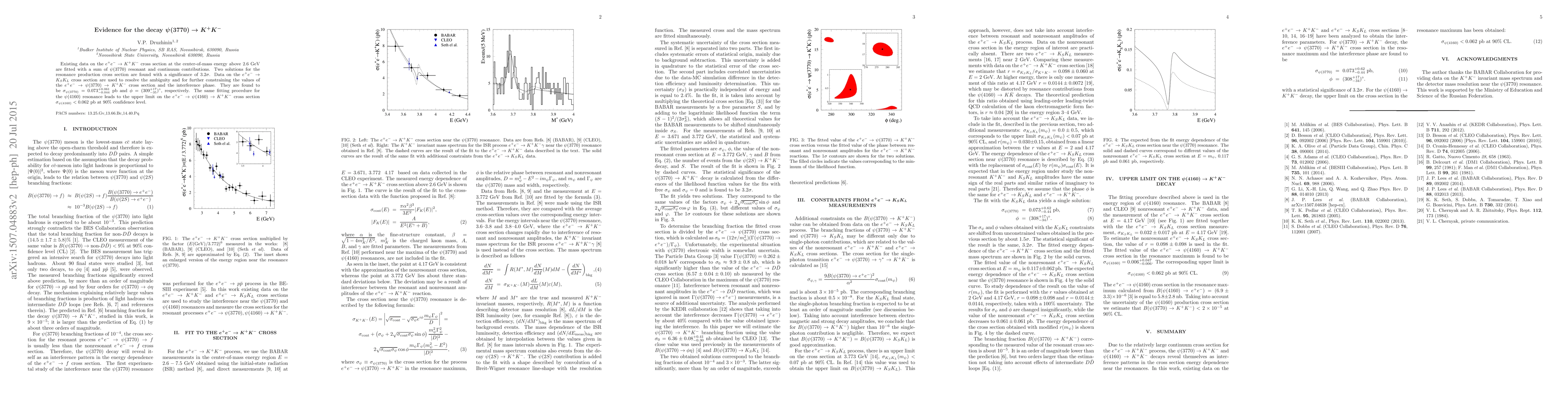 Existing data on the $e^+e^-\to K^+K^-$ cross section at the center-of-mass energy above 2.6 GeV are fitted with a sum of $\psi(3770)$ resonant and continuum contributions. Two solutions for the resonance production cross section are found with a significance of 3.2$\sigma$. Data on the $e^+e^-\to K_SK_L$ cross section are used to resolve the ambiguity and for further constraining the values of the $e^+e^-\to \psi(3770) \to K^+K^-$ cross section and the interference phase. They are found to be $\sigma_{\psi(3770)}=0.073^{+0.061}_{-0.044}$ pb and $\phi=(309^{+17}_{-35})^\circ$, respectively. The same fitting procedure for the $\psi(4160)$ resonance leads to the upper limit on the $e^+e^-\to \psi(4160) \to K^+K^-$ cross section $\sigma_{\psi(4160)}<0.062$ pb at 90\% confidence level.