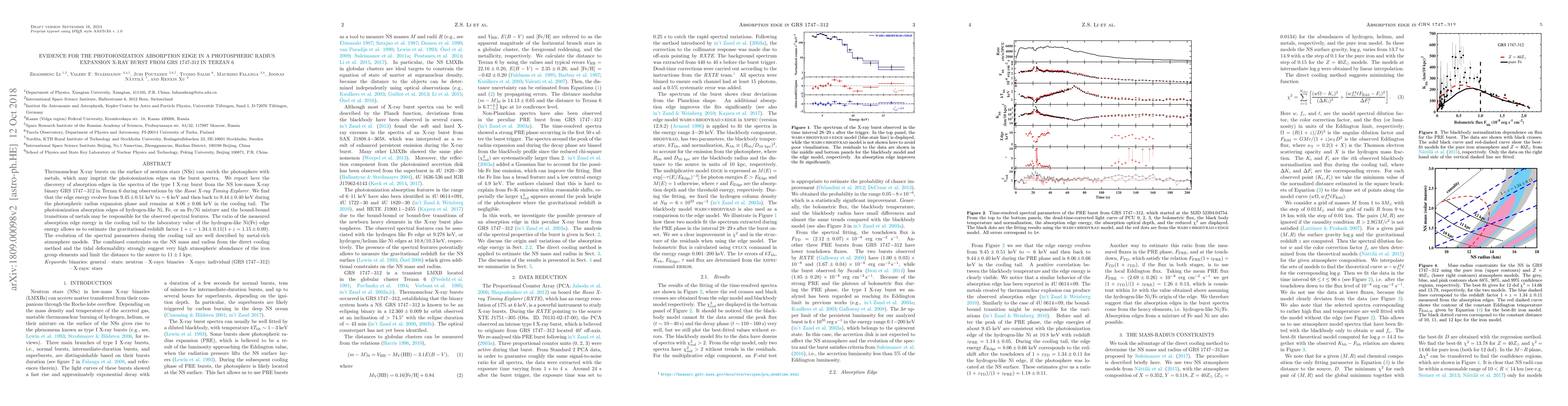 Thermonuclear X-ray bursts on the surface of neutron stars (NSs) can enrich photosphere with metals, which may imprint the photoionization edges on the burst spectra. We report here the discovery of absorption edges in the spectra of the type I X-ray burst from the NS low-mass X-ray binary GRS 1747$-$312 in Terzan 6 during observations by the Rossi X-ray Timing Explorer. We find that the edge energy evolves from $9.45\pm0.51$ keV to $\sim6$ keV and then back to $9.44\pm0.40$ keV during the photospheric radius expansion phase and remains at $8.06\pm0.66$ keV in the cooling tail. The photoionization absorption edges of hydrogen-like Ni, Fe or Fe/Ni mixture and the bound-bound transitions of metals may be responsible for the observed spectral features. The ratio of the measured absorption edge energy in the cooling tail to the laboratory value of hydrogen-like Ni(Fe) edge energy allows us to estimate the gravitational redshift factor $1+z=1.34\pm0.11$($1+z=1.15\pm0.09$). The evolution of the spectral parameters during the cooling tail are well-described by the metal-rich atmosphere models. The combined constraints on the NS mass and radius from the direct cooling method and the tidal deformability strongly suggest very high atmospheric abundance of the iron group elements and limit the distance to the source to $11\pm1$ kpc.