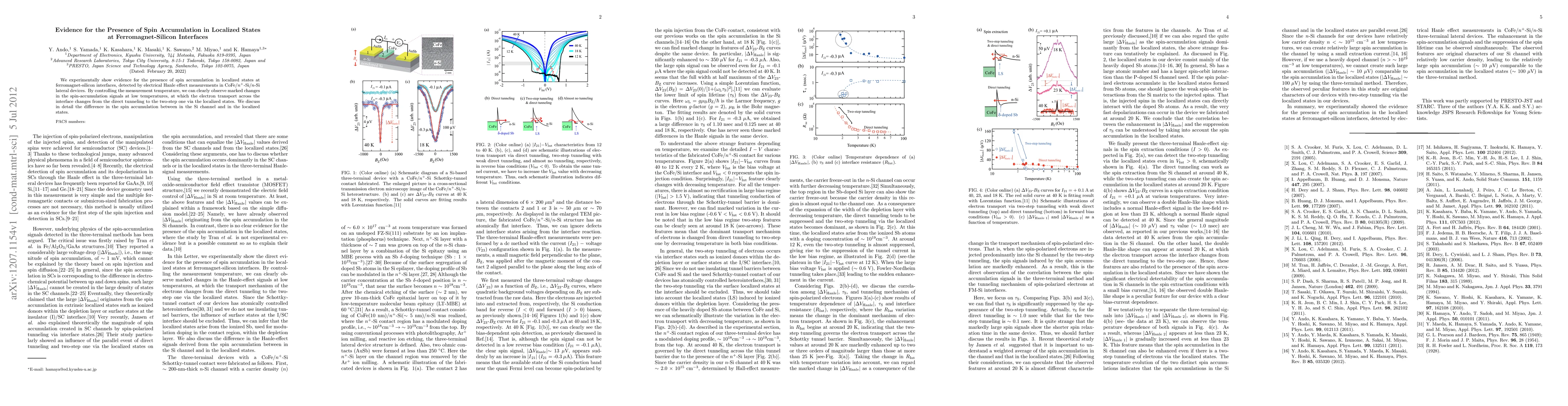 This research demonstrates spin accumulation in localized states at ferromagnet-silicon interfaces via electrical Hanle effect measurements in CoFe/$n^{+}$-Si/$n$-Si devices. Temperature-dependent observations reveal significant changes in spin-accumulation signals, indicating a transition from direct tunneling to two-step transport through localized states at low temperatures.