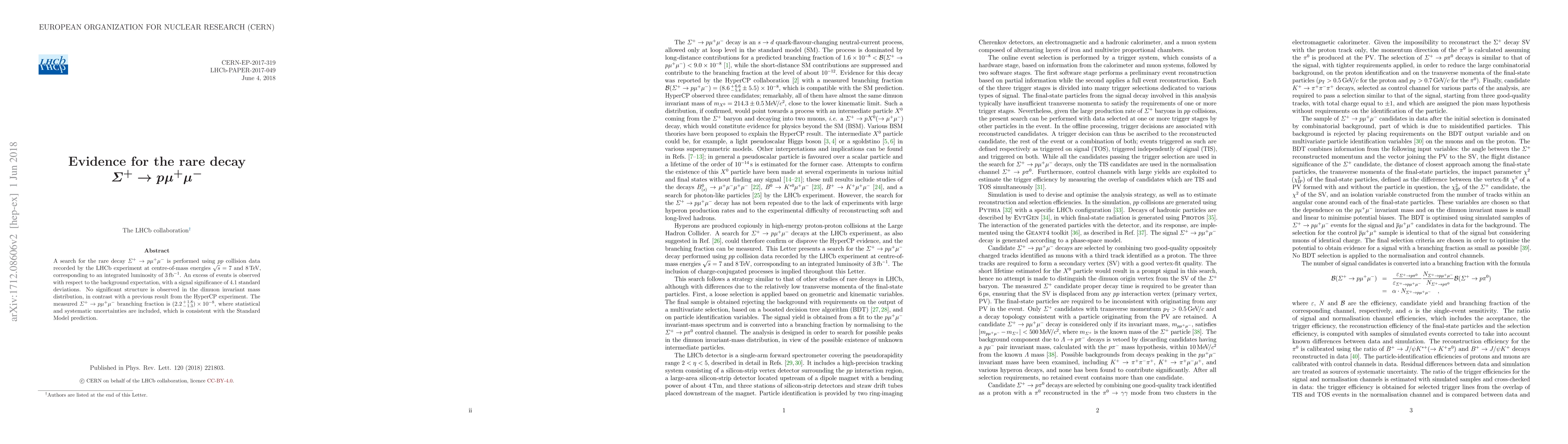 The LHCb experiment observed an excess of the rare decay $\Sigma^+ \to p \mu^+ \mu^-$ with a 4.1 standard deviation significance, yielding a branching fraction of $(2.2\,^{+\,1.8}_{-\,1.3})\times 10^{-8}$, consistent with Standard Model predictions. No significant structure was found in the dimuon mass distribution.