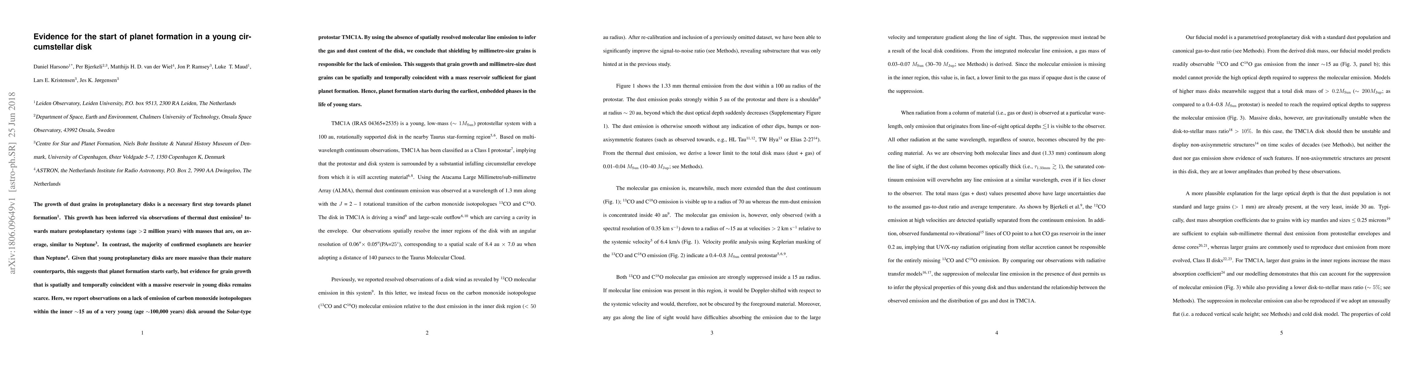 This paper reports observations indicating that grain growth and millimeter-size dust grains are present in a young circumstellar disk around the protostar TMC1A, suggesting early onset of planet formation. The absence of carbon monoxide emission implies sufficient dust shielding, supporting the idea that planet formation begins during the early stages of star development.