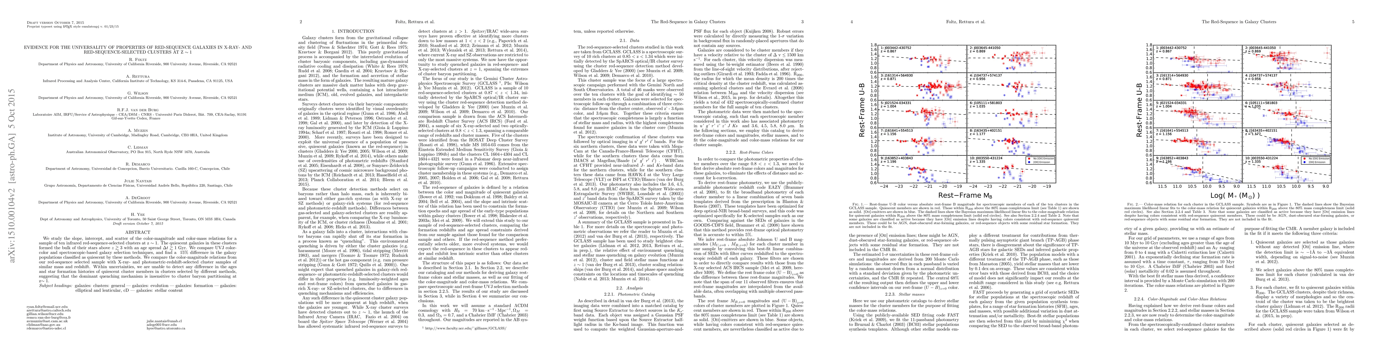 We study the slope, intercept, and scatter of the color-magnitude and color-mass relations for a sample of ten infrared red-sequence-selected clusters at z ~ 1. The quiescent galaxies in these clusters formed the bulk of their stars above z ~ 3 with an age spread {\Delta}t ~ 1 Gyr. We compare UVJ color-color and spectroscopic-based galaxy selection techniques, and find a 15% difference in the galaxy populations classified as quiescent by these methods. We compare the color-magnitude relations from our red-sequence selected sample with X-ray- and photometric- redshift-selected cluster samples of similar mass and redshift. Within uncertainties, we are unable to detect any difference in the ages and star formation histories of quiescent cluster members in clusters selected by different methods, suggesting that the dominant quenching mechanism is insensitive to cluster baryon partitioning at z ~ 1.