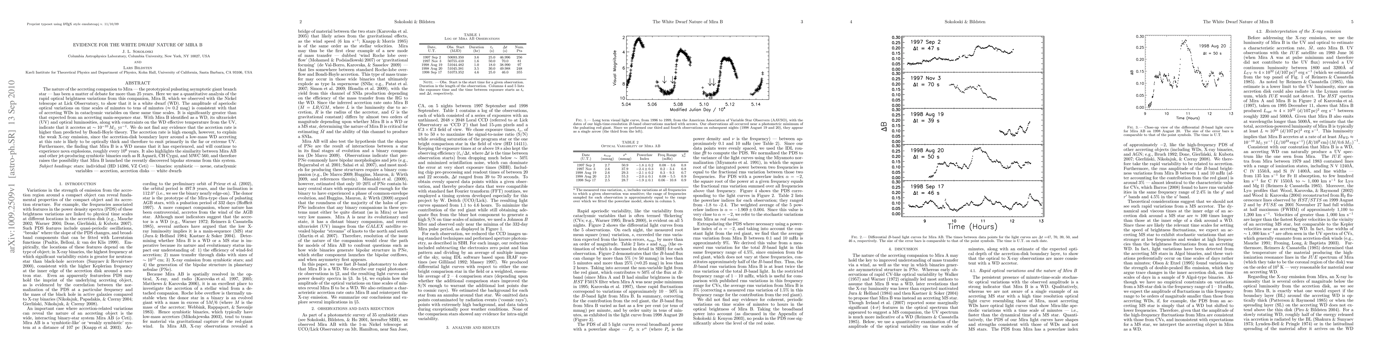 The nature of the accreting companion to Mira --- the prototypical pulsating asymptotic giant branch star --- has been a matter of debate for more than 25 years. Here we use a quantitative analysis of the rapid optical brightness variations from this companion, Mira B, which we observed with the Nickel telescope at Lick Observatory, to show that it is a white dwarf (WD). The amplitude of aperiodic optical variations on time scales of minutes to tens of minutes (approximately 0.2 mag) is consistent with that of accreting WDs in cataclysmic variables on these same time scales. It is significantly greater than that expected from an accreting main-sequence star. With Mira B identified as a WD, its ultraviolet (UV) and optical luminosities, along with constraints on the WD effective temperature from the UV, indicate that it accretes at ~1e-10 solar masses per year. We do not find any evidence that the accretion rate is higher than predicted by Bondi-Hoyle theory. The accretion rate is high enough, however, to explain the weak X-ray emission, since the accretion-disk boundary layer around a low-mass WD accreting at this rate is likely to be optically thick and therefore to emit primarily in the far or extreme UV. Furthermore, the finding that Mira B is a WD means that it has experienced, and will continue to experience nova explosions, roughly every million years. It also highlights the similarity between Mira AB and other jet-producing symbiotic binaries such as R Aquarii, CH Cygni, and MWC 560, and therefore raises the possibility that Mira B launched the recently discovered bipolar streams from this system.