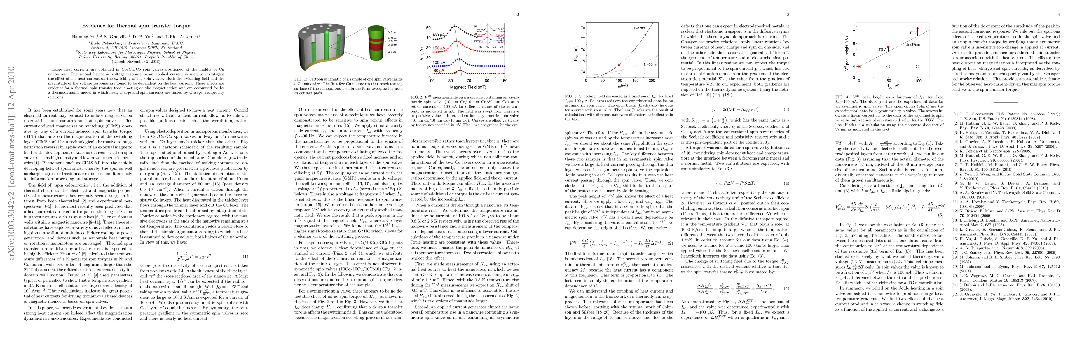 This paper presents evidence for thermal spin transfer torque in Co/Cu/Co spin valves within Cu nanowires, showing that heat currents influence both the switching field and voltage response. The findings are explained by a thermodynamic model linking heat, charge, and spin currents via Onsager reciprocity relations.