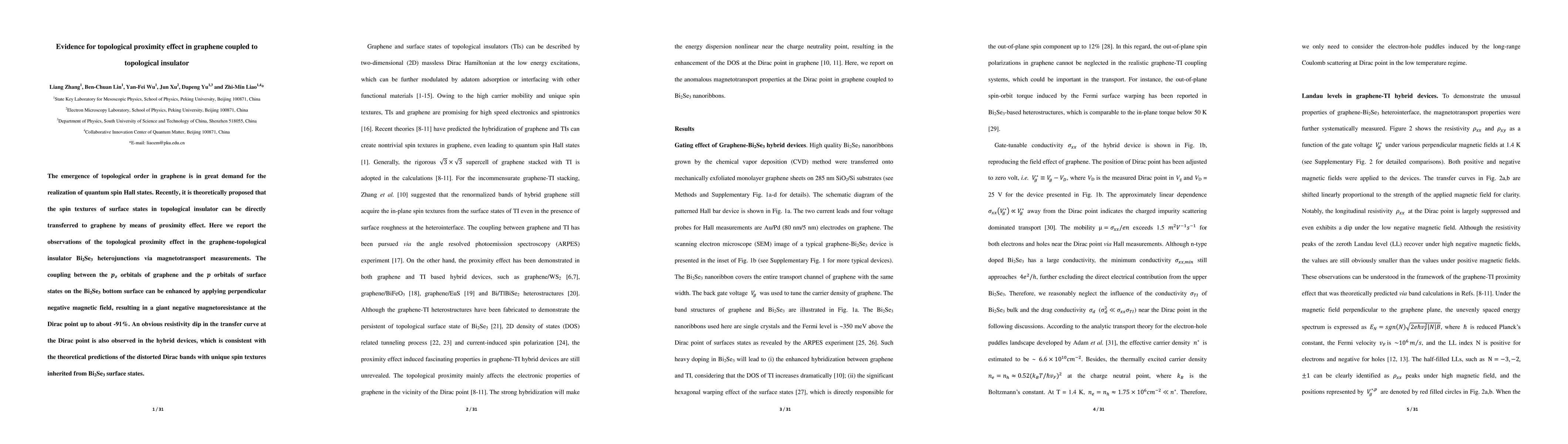 This paper reports experimental evidence for the topological proximity effect in graphene coupled to the topological insulator Bi2Se3, showing a giant negative magnetoresistance and a resistivity dip at the Dirac point due to the coupling of graphene's p_z orbitals with Bi2Se3's surface state p orbitals under a perpendicular magnetic field. This supports theoretical predictions of spin textures transferred from Bi2Se3 to graphene.