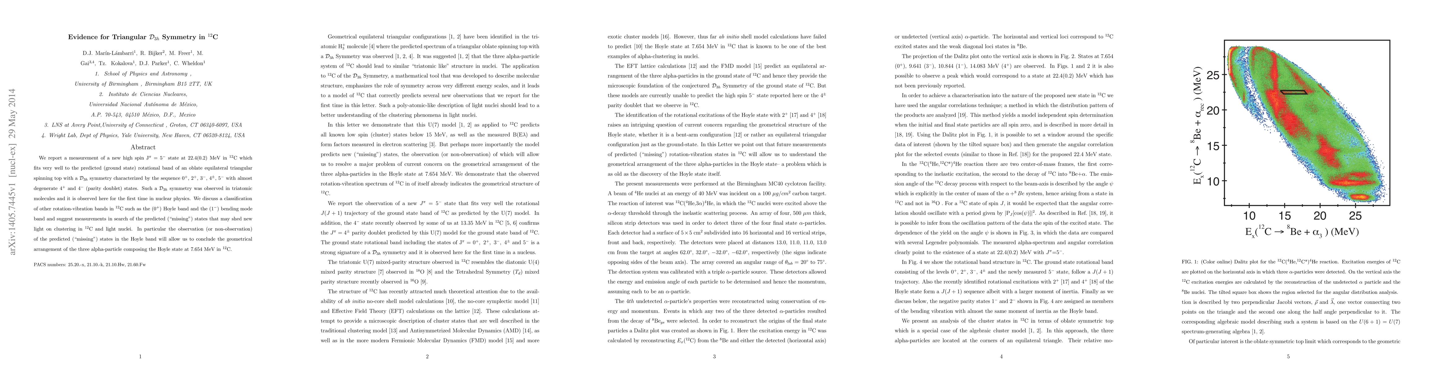We report a measurement of a new high spin Jp = 5- state at 22.4(0.2) MeV in 12C which fits very well to the predicted (ground state) rotational band of an oblate equilateral triangular spinning top with a D_3h symmetry characterized by the sequence 0+, 2+, 3-, 4+/-, 5- with almost degenerate 4+ and 4- (parity doublet) states. Such a D_3h symmetry was observed in triatomic molecules and it is observed here for the first time in nuclear physics. We discuss a classification of other rotation-vibration bands in 12C such as the (0+) Hoyle band and the (1-) bending mode band and suggest measurements in search of the predicted ("missing") states that may shed new light on clustering in 12C and light nuclei. In particular the observation (or non-observation) of the predicted ("missing") states in the Hoyle band will allow us to conclude the geometrical arrangement of the three alpha-particle composing the Hoyle state at 7.654 MeV in 12C.