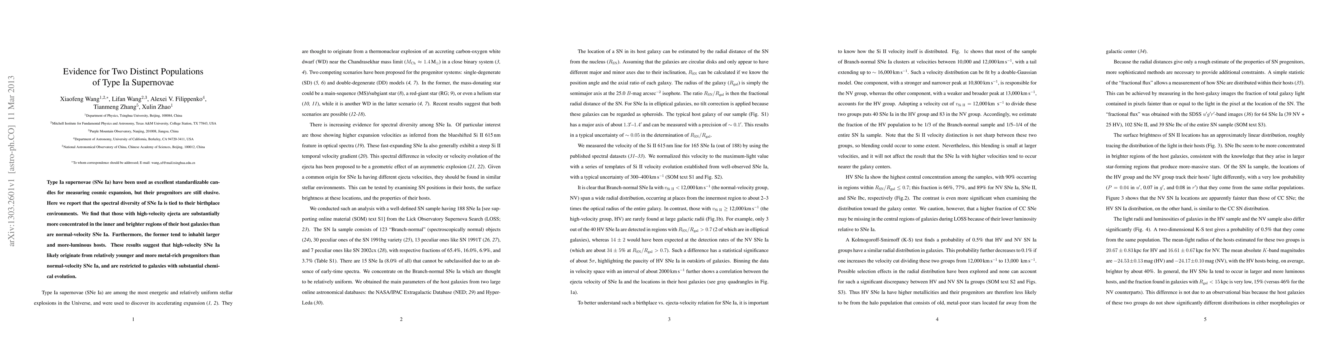 Type Ia supernovae (SNe Ia) have been used as excellent standardizable candles for measuring cosmic expansion, but their progenitors are still elusive. Here we report that the spectral diversity of SNe Ia is tied to their birthplace environments. We find that those with high-velocity ejecta are substantially more concentrated in the inner and brighter regions of their host galaxies than are normal-velocity SNe Ia. Furthermore, the former tend to inhabit larger and more-luminous hosts. These results suggest that high-velocity SNe Ia likely originate from relatively younger and more metal-rich progenitors than normal-velocity SNe Ia, and are restricted to galaxies with substantial chemical evolution.