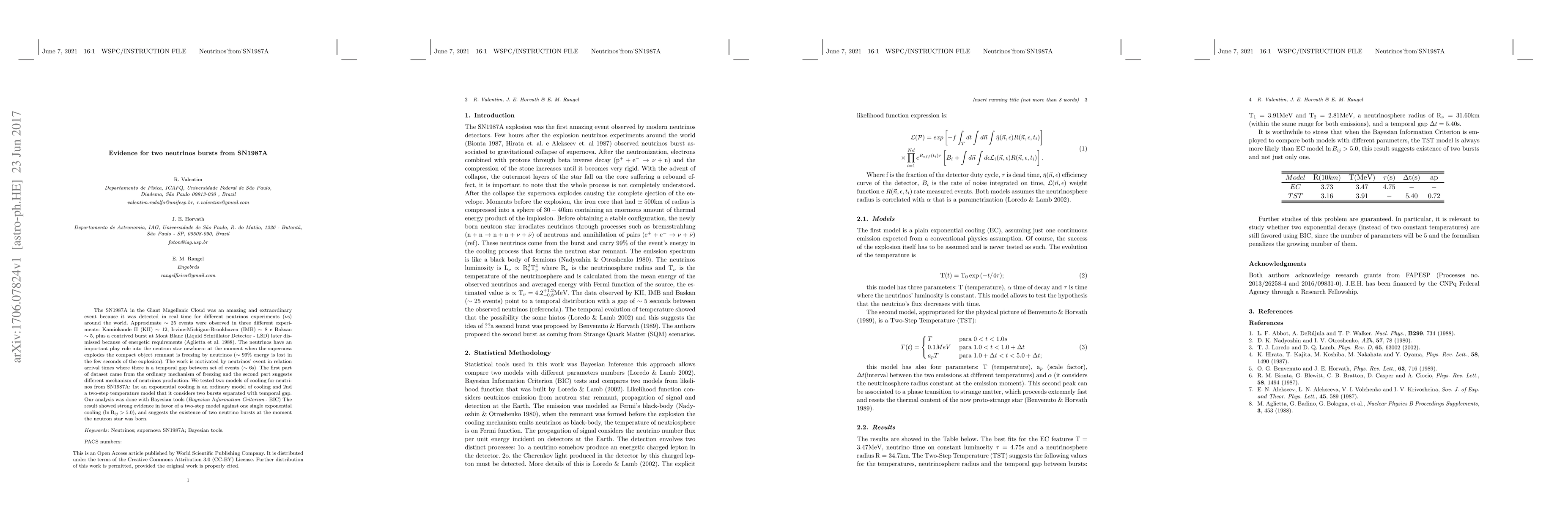 The SN1987A in the Giant Magellanic Cloud was an amazing and extraordinary event because it was detected in real time for different neutrinos experiments ($\nu$s) around the world. Approximate $\sim25$ events were observed in three different experiments: Kamiokande II (KII) $\sim 12$, Irvine-Michigan-Brookhaven (IMB) $\sim 8$ e Baksan $\sim 5$, plus a contrived burst at Mont Blanc (Liquid Scintillator Detector - LSD) later dismissed because of energetic requirements (Aglietta et al. 1988). The neutrinos have an important play role into the neutron star newborn: at the moment when the supernova explodes the compact object remnant is freezing by neutrinos ($\sim99\%$ energy is lost in the few seconds of the explosion). The work is motivated by neutrinos' event in relation arrival times where there is a temporal gap between set of events ($\sim6\mbox{s}$). The first part of dataset came from the ordinary mechanism of freezing and the second part suggests different mechanism of neutrinos production. We tested two models of cooling for neutrinos from SN1987A: 1st an exponential cooling is an ordinary model of cooling and 2nd a two-step temperature model that it considers two bursts separated with temporal gap. Our analysis was done with Bayesian tools ({\it Bayesian Information Criterion} - BIC) The result showed strong evidence in favor of a two-step model against one single exponential cooling ($\ln\mbox{B}_{ij} > 5.0$), and suggests the existence of two neutrino bursts at the moment the neutron star was born.