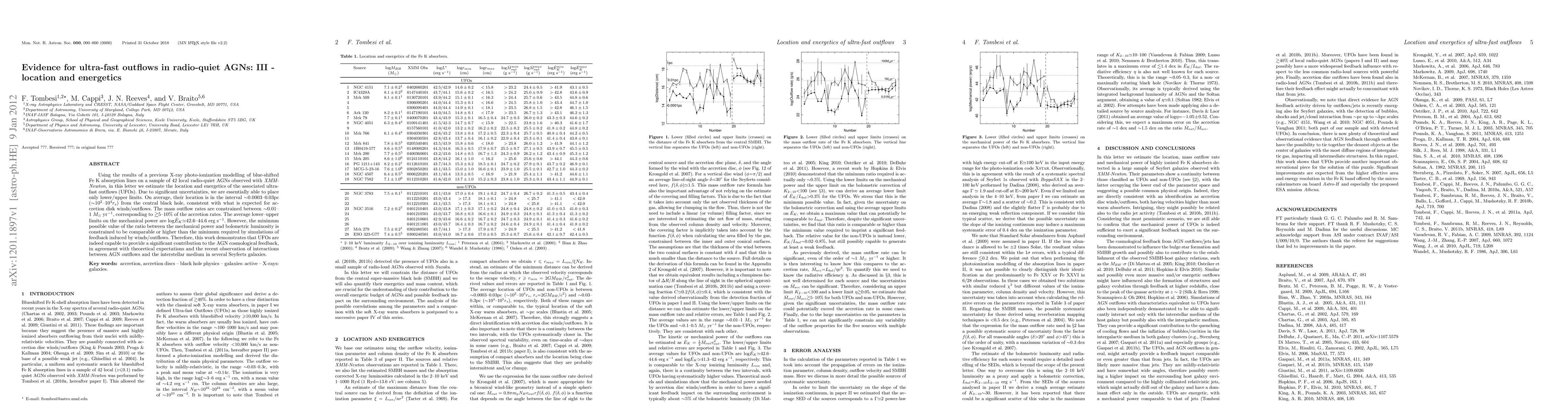 Research estimates that ultra-fast outflows in radio-quiet active galactic nuclei (AGNs) occur within 10,000 solar masses of the black hole at a rate comparable to 5-10% of the accretion rate, suggesting they contribute significantly to AGN cosmological feedback.