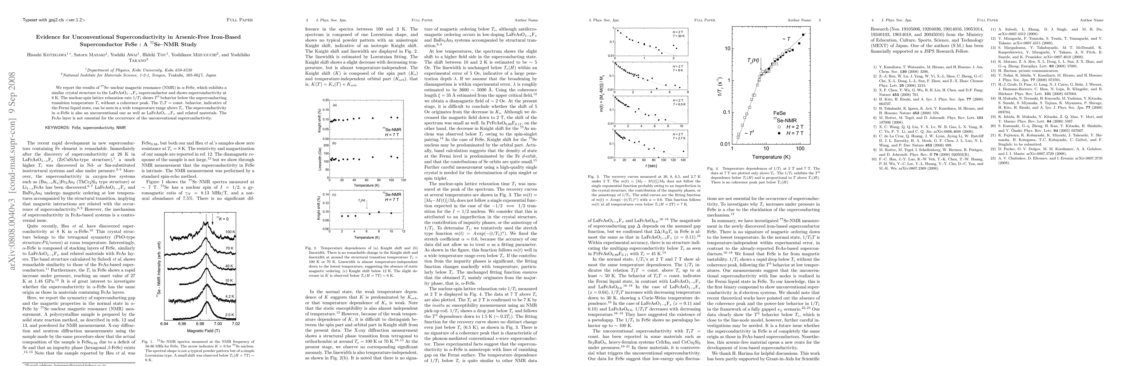 This study reveals unconventional superconductivity in arsenic-free iron-based FeSe using $^{77}$Se-NMR, showing $T^3$ behavior in $1/T_1$ below $T_c$ without a coherence peak. The $T_1T$ constant behavior indicates a Fermi liquid state above $T_c$, suggesting that FeAs layers are not necessary for unconventional superconductivity.
