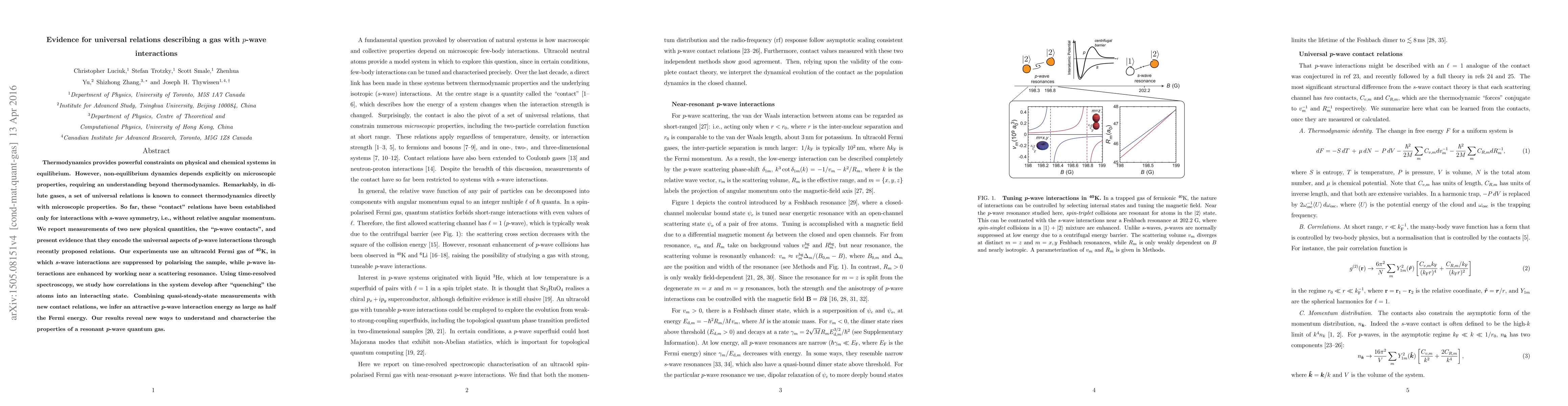 Thermodynamics provides powerful constraints on physical and chemical systems in equilibrium. However, non-equilibrium dynamics depends explicitly on microscopic properties, requiring an understanding beyond thermodynamics. Remarkably, in dilute gases, a set of universal relations is known to connect thermodynamics directly with microscopic properties. So far, these "contact" relations have been established only for interactions with $s$-wave symmetry, i.e., without relative angular momentum. We report measurements of two new physical quantities, the "$p$-wave contacts", and present evidence that they encode the universal aspects of $p$-wave interactions through recently proposed relations. Our experiments use an ultracold Fermi gas of $^{40}$K, in which $s$-wave interactions are suppressed by polarising the sample, while $p$-wave interactions are enhanced by working near a scattering resonance. Using time-resolved spectroscopy, we study how correlations in the system develop after "quenching" the atoms into an interacting state. Combining quasi-steady-state measurements with new contact relations, we infer an attractive $p$-wave interaction energy as large as half the Fermi energy. Our results reveal new ways to understand and characterise the properties of a resonant $p$-wave quantum gas.