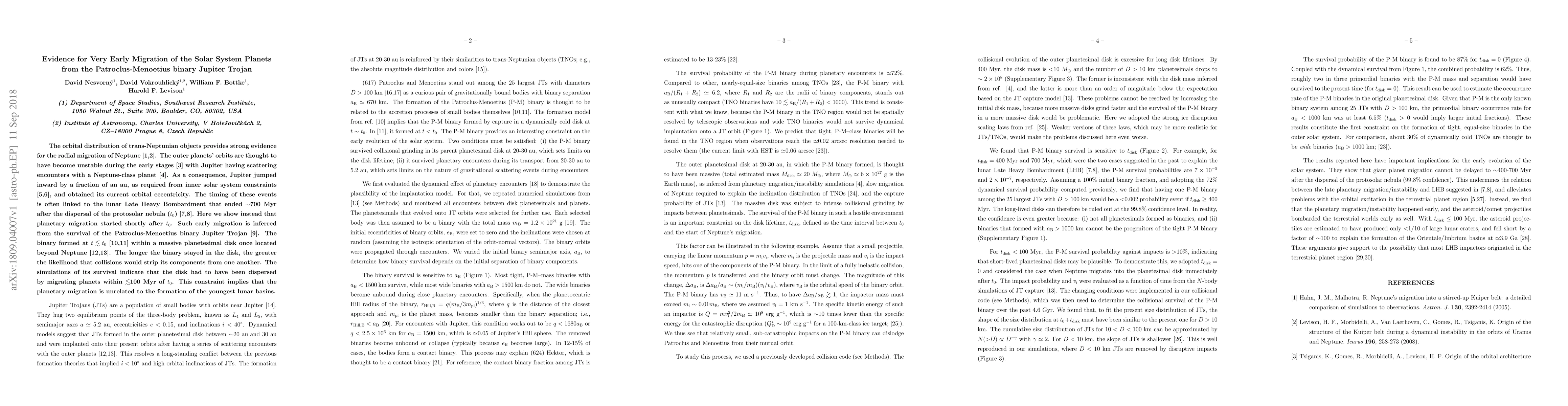 This paper argues that planetary migration in the early solar system occurred much earlier than previously thought, evidenced by the survival of the Patroclus-Menoetius binary Jupiter Trojan, suggesting migration began within 100 Myr after the solar nebula's dispersal, independent of the Late Heavy Bombardment.