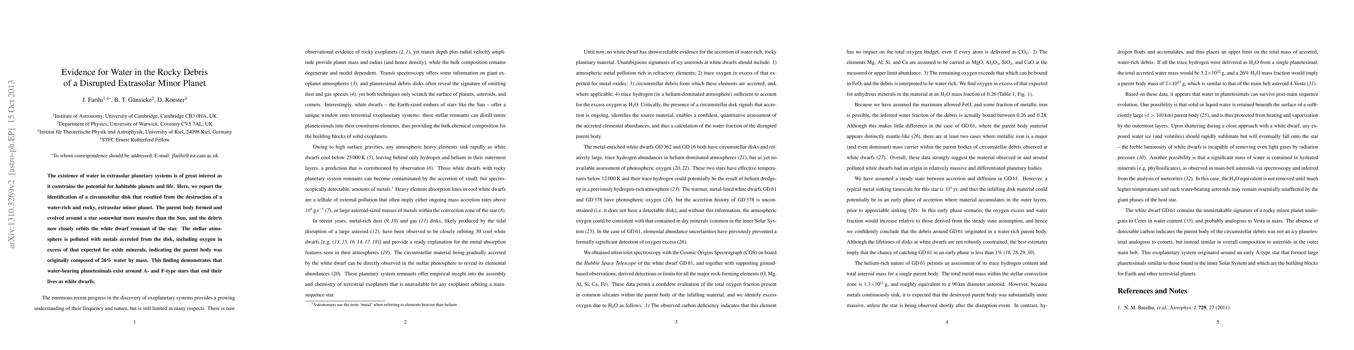 This study identifies a circumstellar disk from a disrupted water-rich extrasolar minor planet orbiting a white dwarf, revealing 26% water by mass in the parent body. This discovery indicates the presence of water-bearing planetesimals around stars that evolve into white dwarfs.