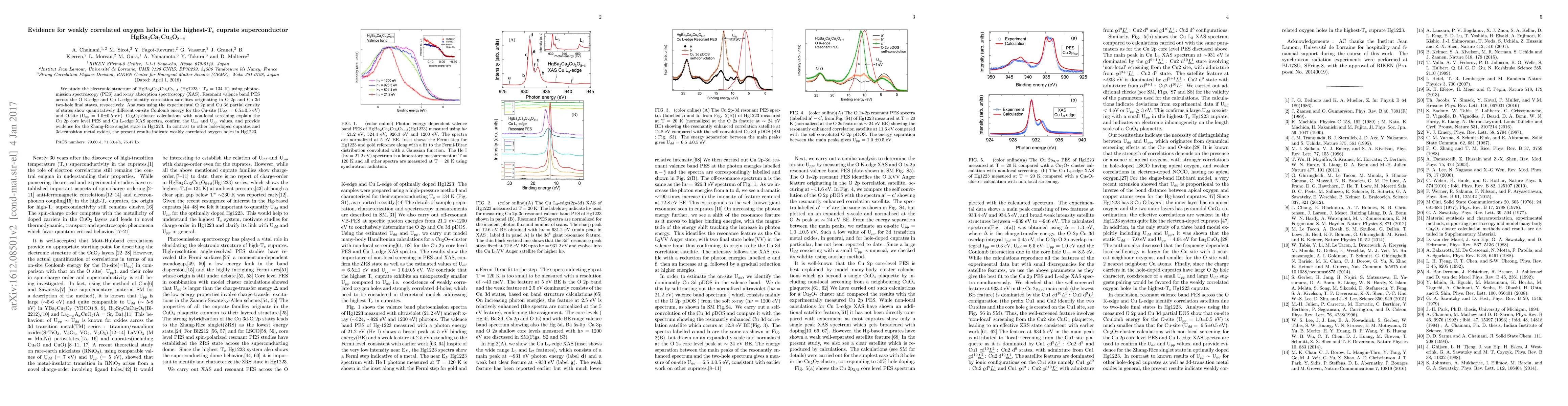 We study the electronic structure of HgBa$_2$Ca$_2$Cu$_3$O$_{8+\delta}$ (Hg1223 ; T$_{c}$ = 134 K) using photoemission spectroscopy (PES) and x-ray absorption spectroscopy (XAS). Resonant valence band PES across the O K-edge and Cu L-edge identify correlation satellites originating in O 2p and Cu 3d two-hole final states, respectively. Analyses using the experimental O 2p and Cu 3d partial density of states show quantitatively different on-site Coulomb energy for the Cu-site (U$_{dd}$ = 6.5$\pm$0.5 eV) and O-site (U$_{pp}$ = 1.0$\pm$0.5 eV). Cu$_{2}$O$_{7}$-cluster calculations with non-local screening explain the Cu 2p core level PES and Cu L-edge XAS spectra, confirm the U$_{dd}$ and U$_{pp}$ values, and provide evidence for the Zhang-Rice singlet state in Hg1223. In contrast to other hole-doped cuprates and 3d-transition metal oxides, the present results indicate weakly correlated oxygen holes in Hg1223.