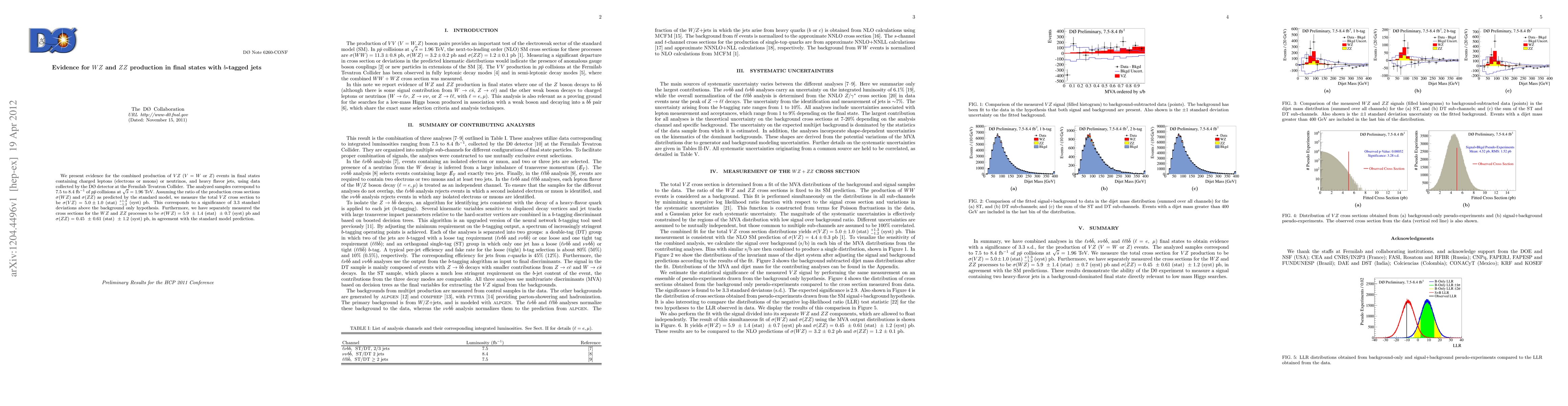 We present evidence for the combined production of VZ (V=W or Z) events in final states containing charged leptons (electrons or muons) or neutrinos, and heavy flavor jets, using data collected by the DO detector at the Fermilab Tevatron Collider. The analyzed samples correspond to 7.5 to 8.4/fb of ppbar collisions at sqrt s = 1.96 TeV. Assuming the ratio of the production cross sections sigma(WZ) and sigma(ZZ) as predicted by the standard model, we measure the total VZ cross section to be sigma(VZ) = 5.0 +- 1.0 (stat) +1.3 -1.2 (syst) pb. This corresponds to a significance of 3.3 standard deviations above the background only hypothesis. Furthermore, we have separately measured the cross sections for the WZ and ZZ processes to be simga(WZ) = 5.9 +- 1.4 (stat) +- 0.7 (syst) pb and sigma(ZZ) = 0.45 +- 0.61 (stat) +- 1.2 (syst) pb, in agreement with the standard model prediction.