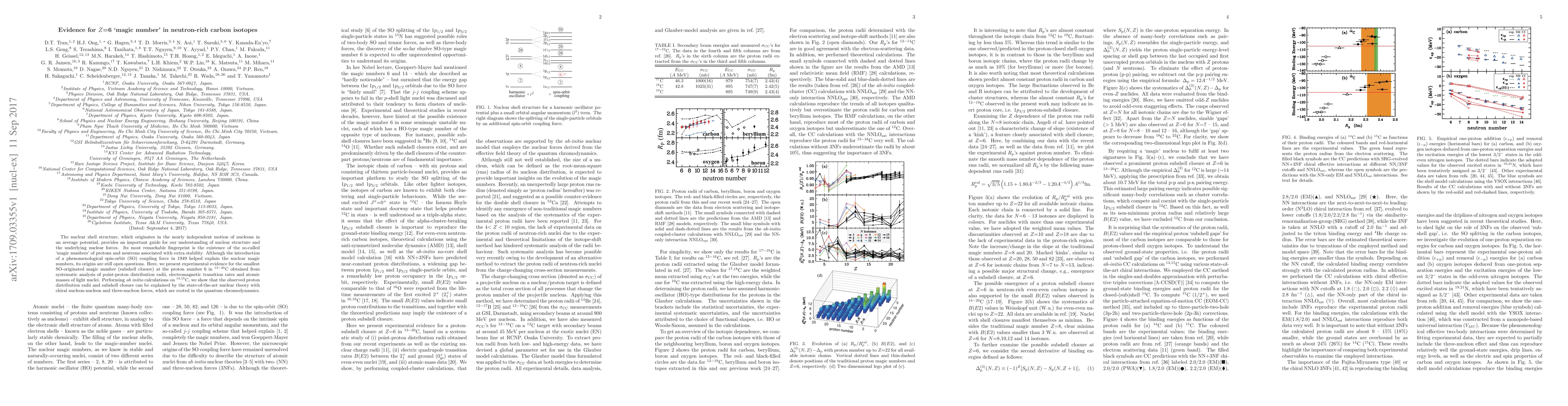 The paper presents an experimental and theoretical investigation of neutron-rich carbon isotopes, identifying evidence for a proton subshell closure at Z=6, supported by ab initio calculations using chiral nucleon-nucleon and three-nucleon forces.