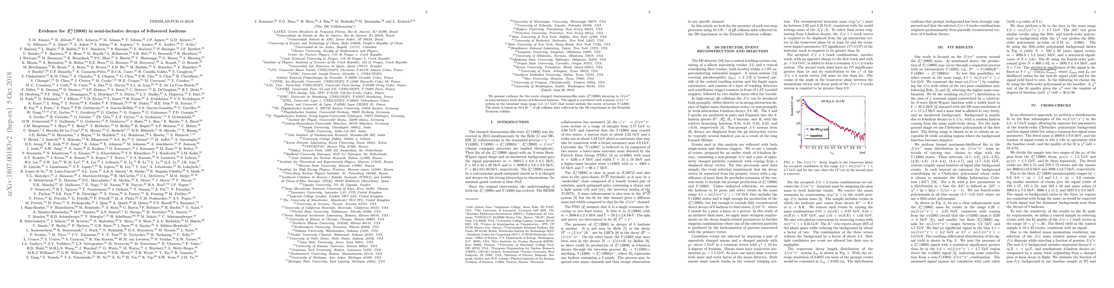 We present evidence for the exotic charged charmonium-like state $Z_c^{\pm}(3900)$ in semi-inclusive weak decays of $b$-flavored hadrons. The signal is correlated with a $J/\psi \pi^+ \pi^-$ system in the invariant mass range 4.2$-$4.7~GeV and includes the sequential process $b$-quark hadron $ \rightarrow Y(4260) +$ anything, $Y(4260) \rightarrow Z_c^{\pm}(3900) \pi^{\mp}$, $Z_c^{\pm}(3900) \rightarrow J/\psi \pi^{\pm}$. The study is based on $10.4~\rm{fb^{-1}}$ of $p \overline p $ collision data collected by the D0 experiment at the Fermilab Tevatron collider.