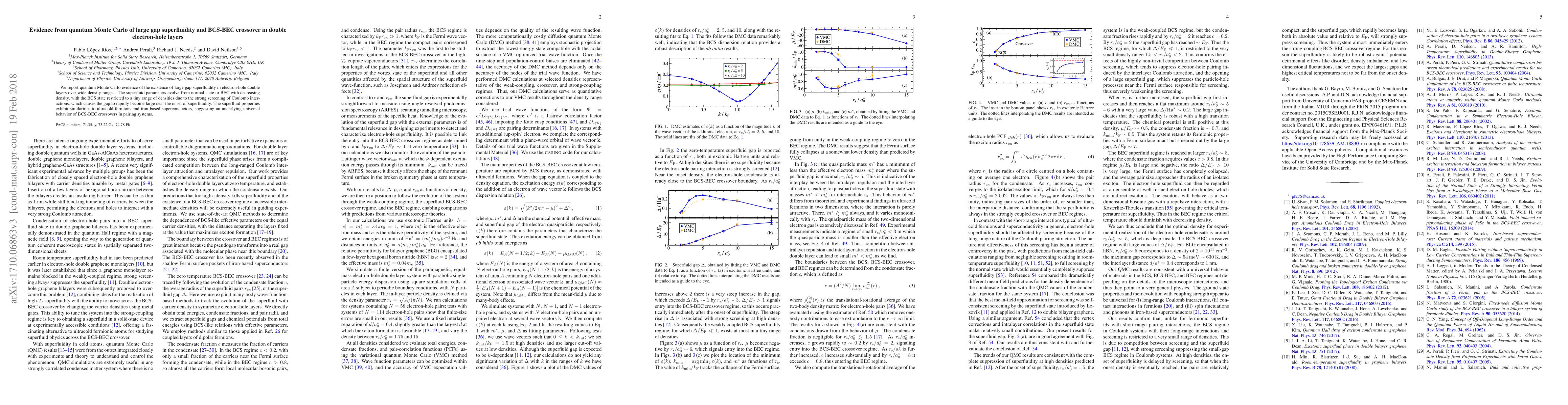 This research paper presents quantum Monte Carlo evidence for large gap superfluidity in electron-hole double layers, showing a BCS-BEC crossover with superfluid parameters transitioning from normal to Bose-Einstein condensation as density decreases. The study suggests universal BCS-BEC crossover behavior in pairing systems, akin to ultracold fermions and iron-based superconductors.