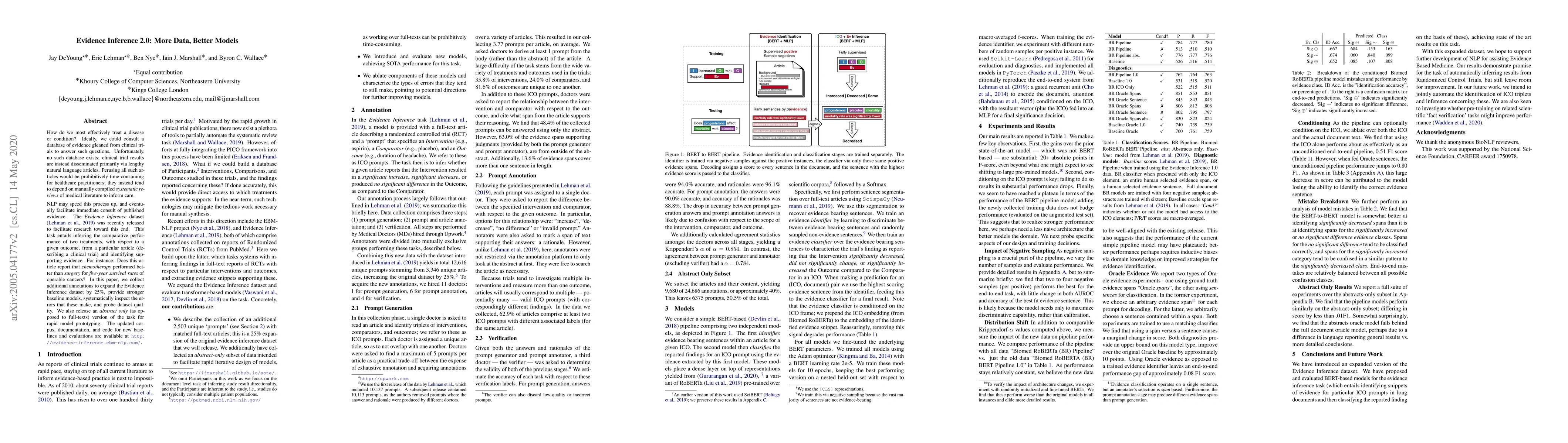 How do we most effectively treat a disease or condition? Ideally, we could consult a database of evidence gleaned from clinical trials to answer such questions. Unfortunately, no such database exists; clinical trial results are instead disseminated primarily via lengthy natural language articles. Perusing all such articles would be prohibitively time-consuming for healthcare practitioners; they instead tend to depend on manually compiled systematic reviews of medical literature to inform care. NLP may speed this process up, and eventually facilitate immediate consult of published evidence. The Evidence Inference dataset was recently released to facilitate research toward this end. This task entails inferring the comparative performance of two treatments, with respect to a given outcome, from a particular article (describing a clinical trial) and identifying supporting evidence. For instance: Does this article report that chemotherapy performed better than surgery for five-year survival rates of operable cancers? In this paper, we collect additional annotations to expand the Evidence Inference dataset by 25\%, provide stronger baseline models, systematically inspect the errors that these make, and probe dataset quality. We also release an abstract only (as opposed to full-texts) version of the task for rapid model prototyping. The updated corpus, documentation, and code for new baselines and evaluations are available at http://evidence-inference.ebm-nlp.com/.