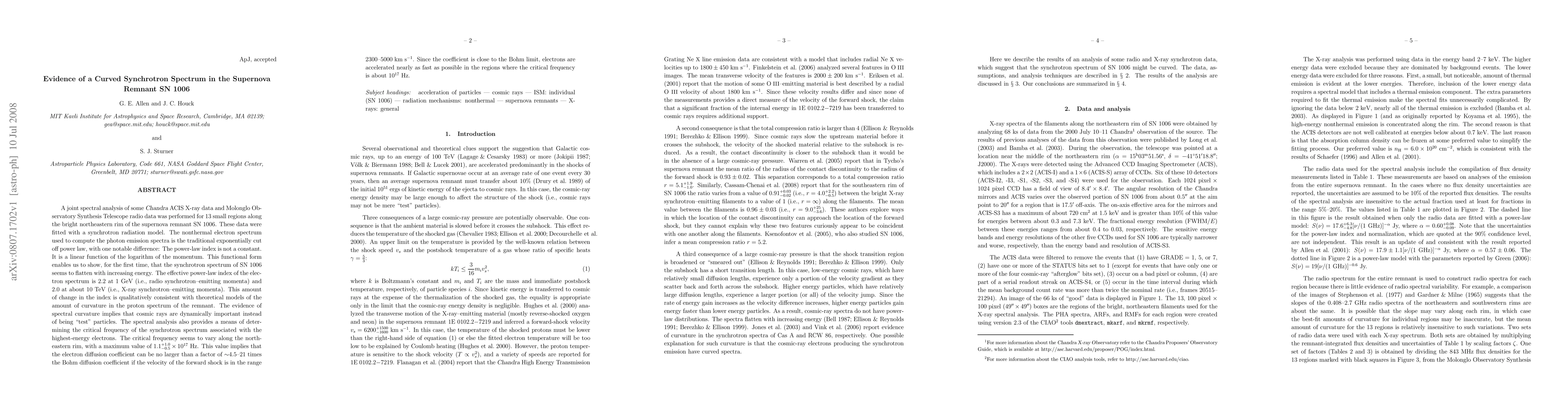 This paper presents evidence of a curved synchrotron spectrum in the supernova remnant SN 1006, showing that the spectrum flattens with increasing energy, suggesting cosmic rays play a dynamic role. The analysis indicates the electron spectrum's power-law index changes from 2.2 at 1 GeV to 2.0 at 10 TeV, supporting theoretical models and implying electrons are accelerated nearly to the Bohm diffusion limit.