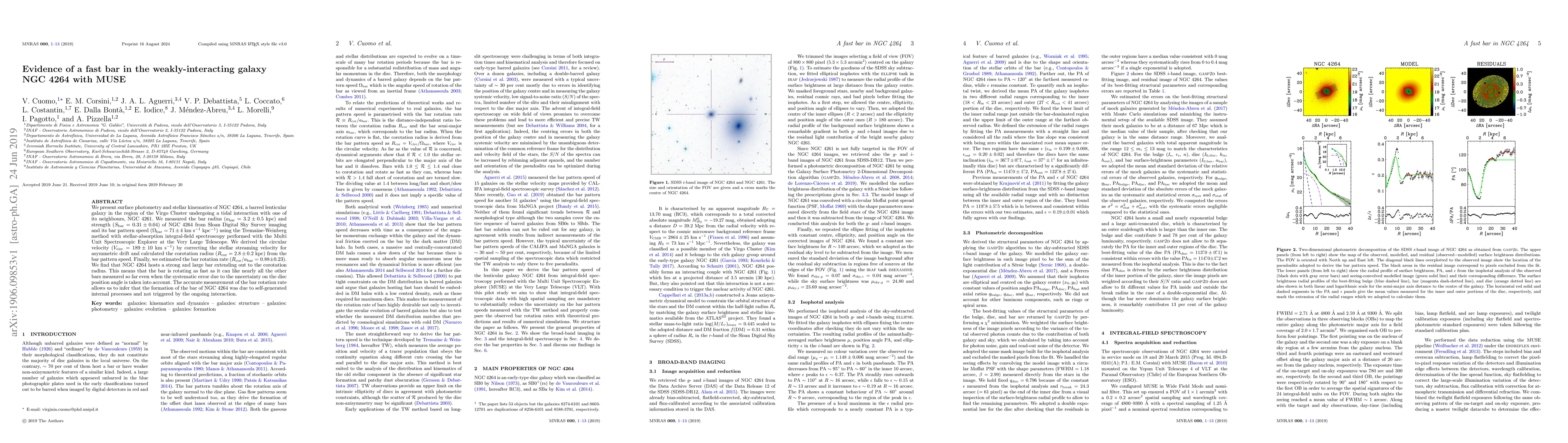 We present surface photometry and stellar kinematics of NGC 4264, a barred lenticular galaxy in the region of the Virgo Cluster undergoing a tidal interaction with one of its neighbours, NGC 4261. We measured the bar radius (a_bar=3.2 +/-0.5 kpc) and strength (S_bar=0.31+/-0.04) of NGC 4264 from Sloan Digital Sky Survey imaging and its bar pattern speed (Omega_bar=71+/-4 km/s/kpc) using the Tremaine-Weinberg method with stellar-absorption integral-field spectroscopy performed with the Multi Unit Spectroscopic Explorer at the Very Large Telescope. We derived the circular velocity (V_circ=189+/-10 km/s) by correcting the stellar streaming velocity for asymmetric drift and calculated the corotation radius (R_cor=2.8+/-0.2 kpc) from the bar pattern speed. Finally, we estimated the bar rotation rate (R_cor/a_bar=0.88+/-0.23). We find that NGC 4264 hosts a strong and large bar extending out to the corotation radius. This means that the bar is rotating as fast as it can like nearly all the other bars measured so far even when the systematic error due to the uncertainty on the disc position angle is taken into account. The accurate measurement of the bar rotation rate allows us to infer that the formation of the bar of NGC 4264 was due to self-generated internal processes and not triggered by the ongoing interaction.