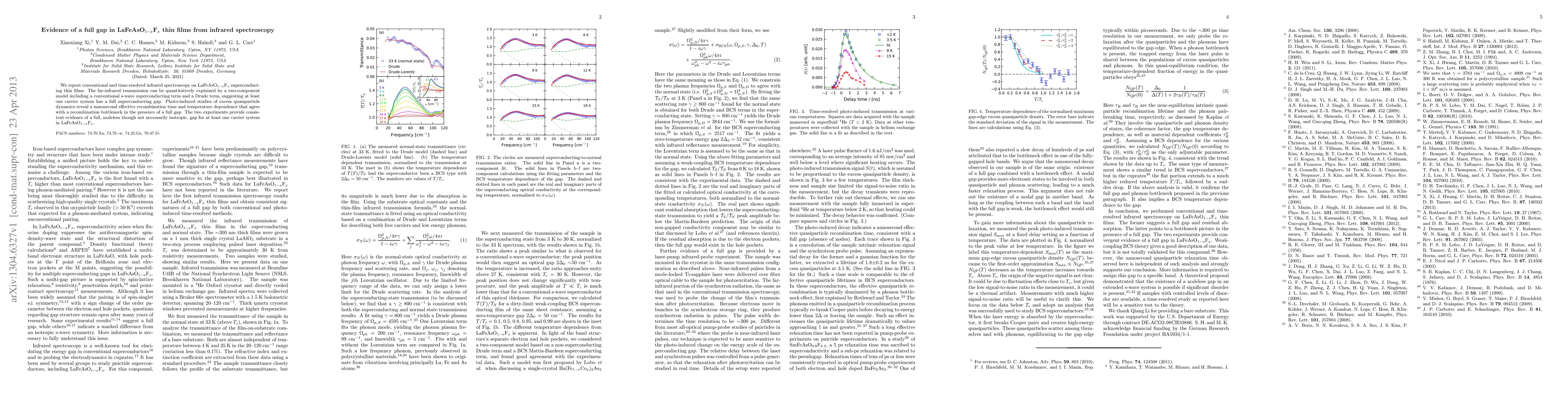 This study uses conventional and time-resolved infrared spectroscopy to demonstrate a full superconducting gap in LaFeAsO$_{1-x}$F$_x$ thin films, supported by a two-component model and nanosecond recombination dynamics. The findings suggest a nodeless, though not necessarily isotropic, superconducting gap for at least one carrier system.