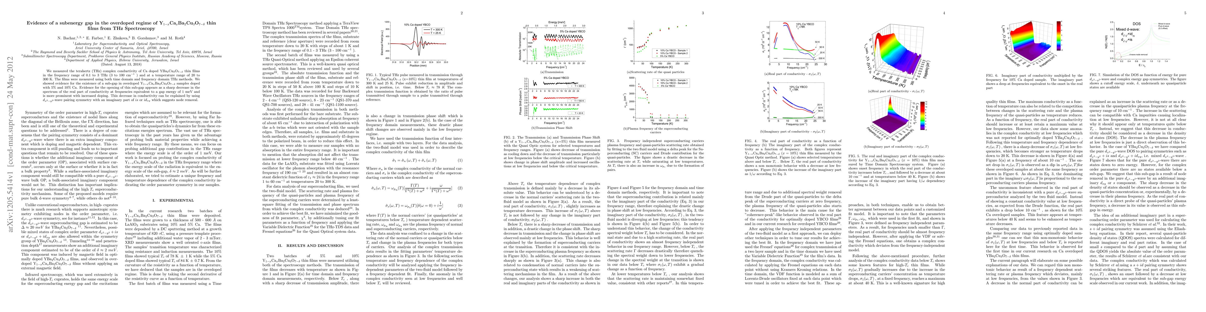 Researchers found evidence of a sub-energy gap in overdoped YBa2Cu3O7-φ thin films using THz spectroscopy, which could explain a sharp decrease in conductivity at low frequencies.